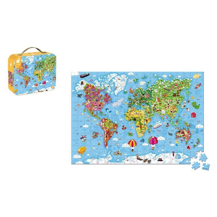 Świetny wybór dla starszych dzieci, układanka łącząca zabawę z nauką. Puzzle w walizce składają się aż z 300 elementów i po ułożeniu tworzą mapę świata. Znajdziesz na niej informacje, które przybliżą Ci naturę i mieszkańców wybranych miejsc. Gotowy obrazek jest naprawdę spory - 99 x 69 cm. Puzzle mają kształt ułatwiający ich łączenie. Materiał z jakiego zostały wykonane to trwały karton. Opakowanie jest estetyczną walizeczką, która ładnie się prezentuje i idealnie pasuje na prezent. Puzzle pozwalają nie tylko na ułożenie obrazka ale też na zwiększenie zasobu wiedzy. Samo układanie stymuluje mózg, rozwija pamięć, logiczne myślenie i zwiększa koncentrację. Wpływa dobrze na cierpliwość oraz ćwiczy motorykę.