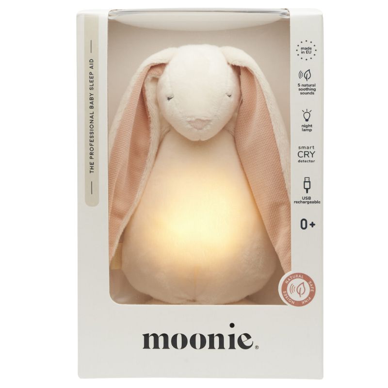 Różowe szumy MOONIE, wygłuszają dźwięki z otoczenia, dzięki czemu, codzienne, domowe hałasy nie wybudzają maluszka ze snu. Szumiący przyjaciel MOONIE posiada moduł z możliwością regulacji głośności, można więc dobrać odpowiedni poziom głośności do warunków i potrzeb dziecka.