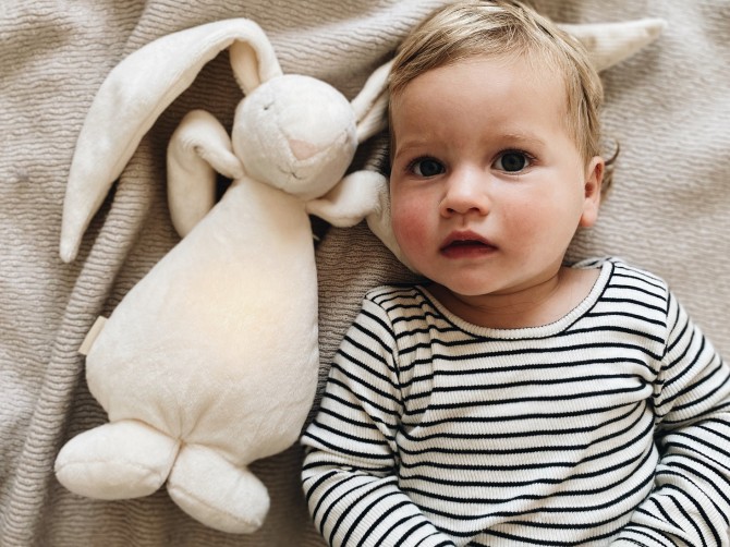 Szumiącego króliczka MOONIE wyposażono w inteligentny czujnik płaczu. Sprawdza się doskonale w razie nagłego przebudzenia maluszka w nocy lub podczas drzemki. Czujnik reaguje na płacz dziecka naturalnym dźwiękiem różowego szumu, który delikatnie wycisza malucha. Zabawka emituje dźwięk przez 30 minut, po czym pozostaje w trybie czuwania przez 3 godziny. Możemy samodzielnie wybrać odtwarzany dźwięk oraz światło. Szumiący przyjaciel będzie korzystał z ustawień aż do dokonania ich zmiany. Inteligentny czujnik można także wykorzystać bez szumów. Szumiący królik MOONIE ładuje się dzięki USB. Nie wymaga więc zakupu baterii co ma pozytywny wpływ na środowisko. Pełne naładowanie zajmuje 3 godziny i wystarcza na 8 godzin pracy, przy użyciu światła i dźwięku jednocześnie. Do zabawki dołączono przewód USB.