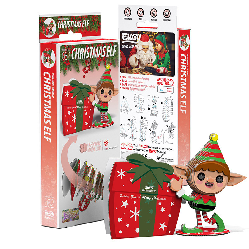 Przywitaj się z bożonarodzeniowym elfem, małym pomocnikiem Świętego Mikołaja. Efy może i są małe, ale bez nich Święty Mikołaj nie zdążyłby rozdać prezentów na czas. Elf Eugy jest częścią świątecznej serii układanek Eugy, w której jest Święty Mikołaj, renifer Rudolf i bałwanek. Ma dużą, ruchomą główkę, którą można ustawić w dowolnym kierunku. Elf ma szpiczaste uszy, charakterystyczna cecha elfów. Możesz wpisać życzenia świąteczne w pudełku, które trzyma elfik.