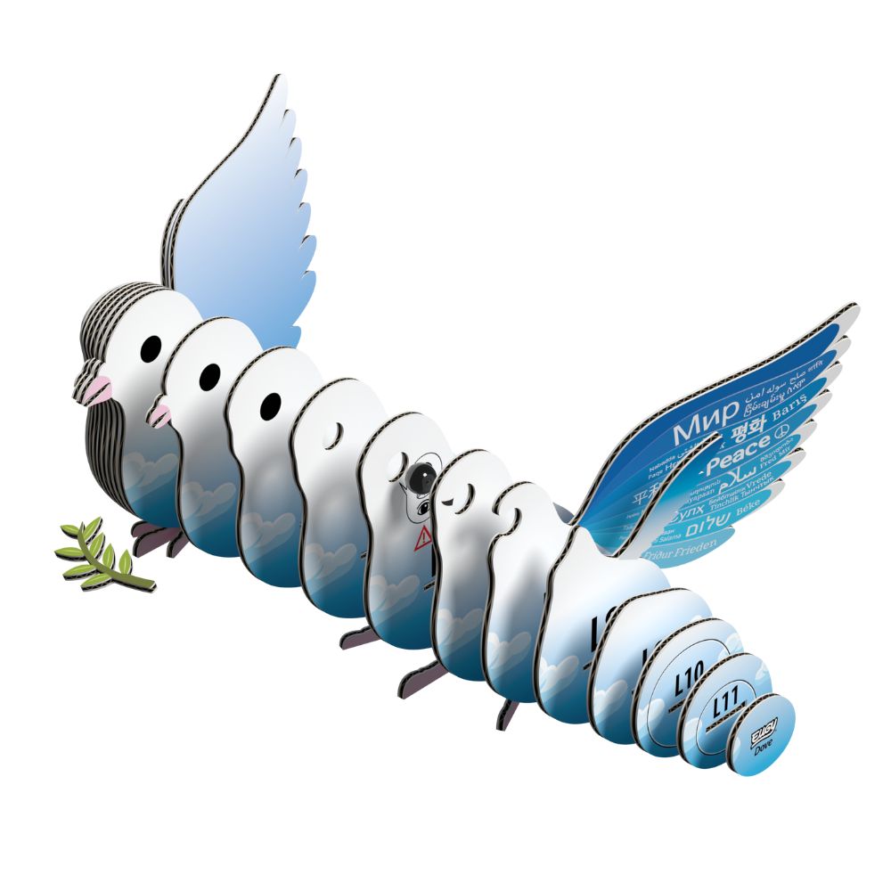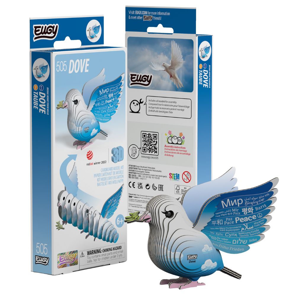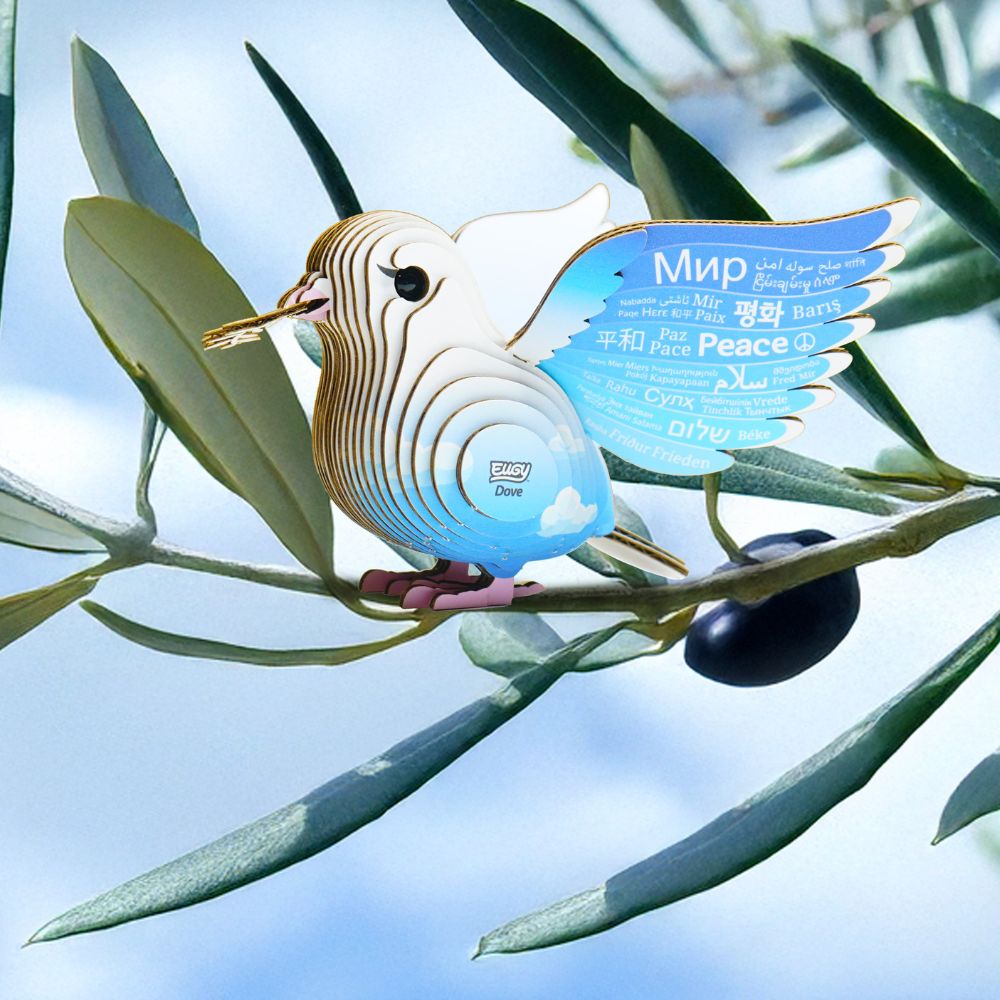 Gołąbek Pokoju Eugy łączy w sobie piękno układanki z pięknym przesłaniem. Gołąbek jest zarówno zabawką kreatywną, jak i dekoracją. Biały gołąbek ma pomalowane na niebiesko skrzydła, ciało jest biało-błękitne z chmurkami. Gołąb w dziobie ma oliwną gałązkę.