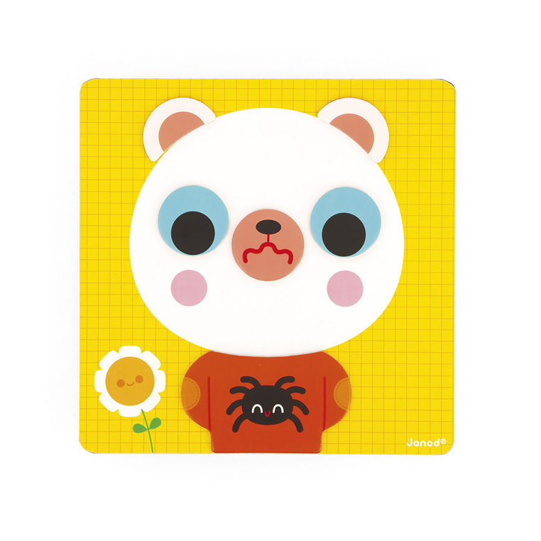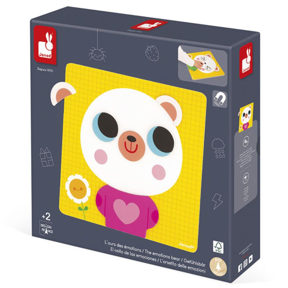 Magnetyczna układanka Emocje francuskiej marki Janod to wyjątkowa zabawka edukacyjna, która w przyjazny i angażujący sposób wprowadza dziecko w świat emocji. Głównym bohaterem zestawu jest uroczy biały miś, którego buzię i strój można zmieniać za pomocą magnetycznych elementów, odtwarzając emocje przedstawione na kartach lub tworząc własne kombinacje.