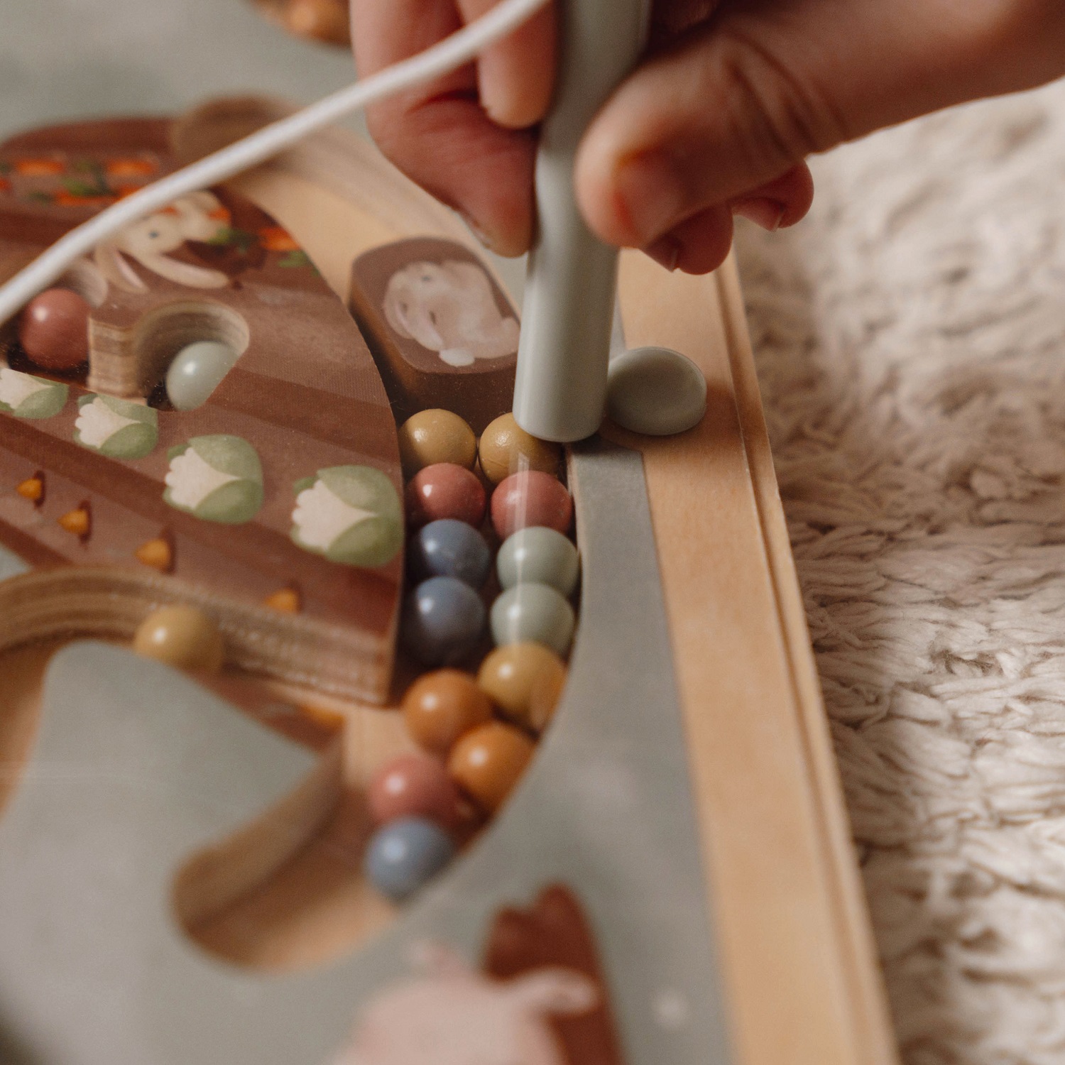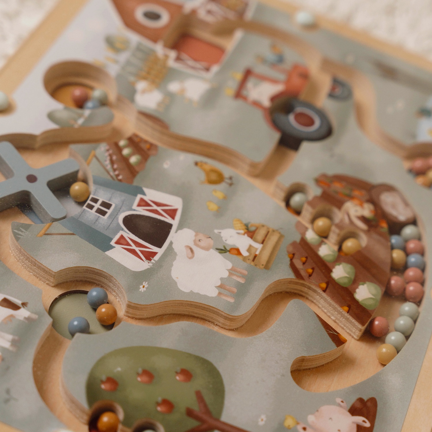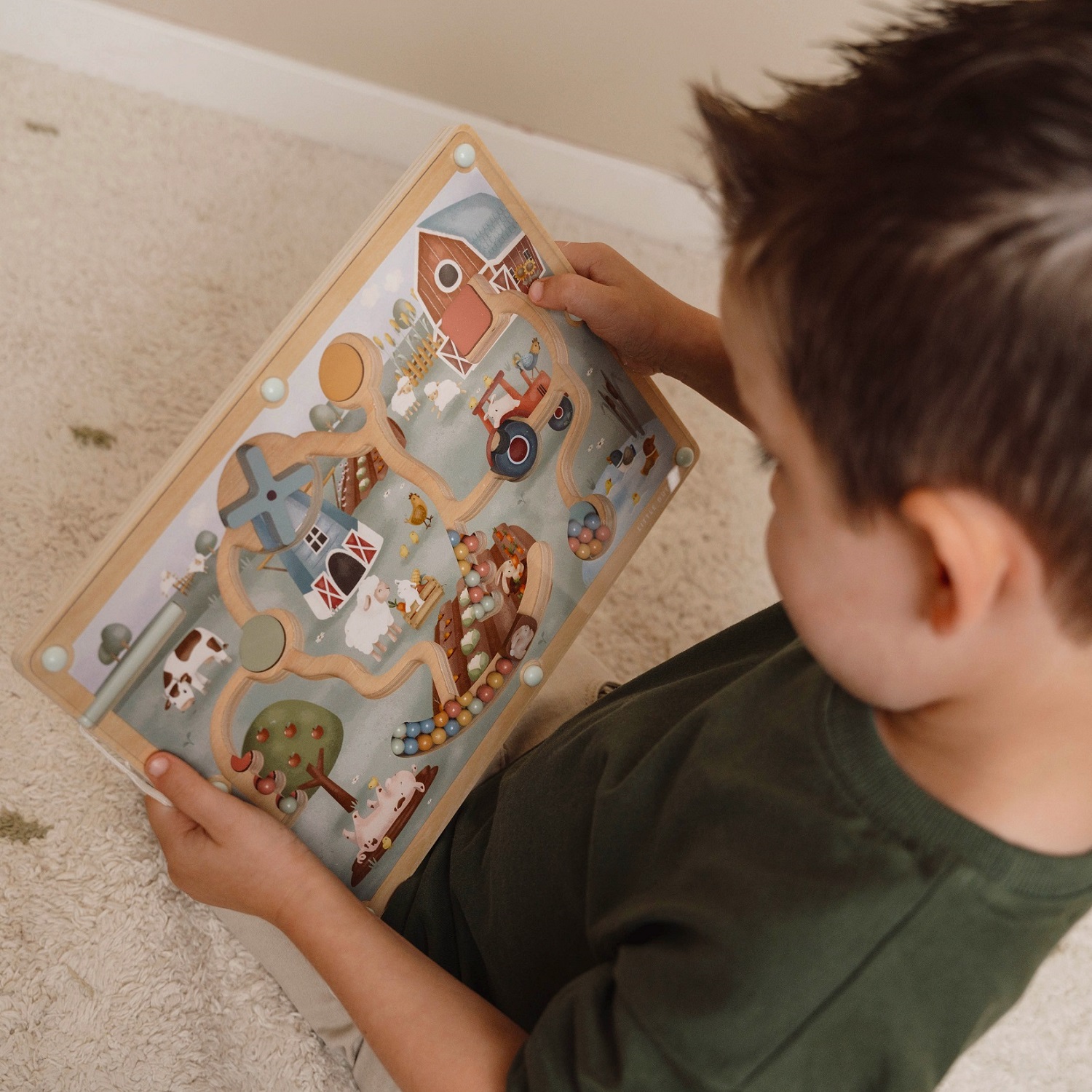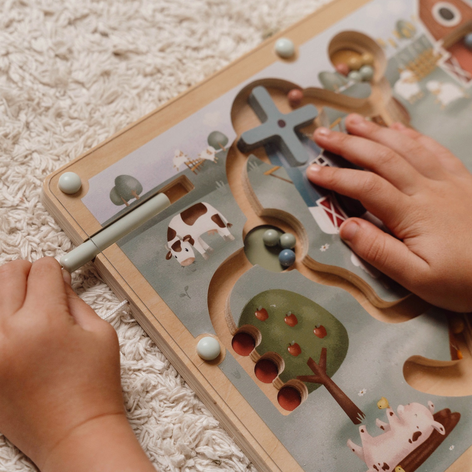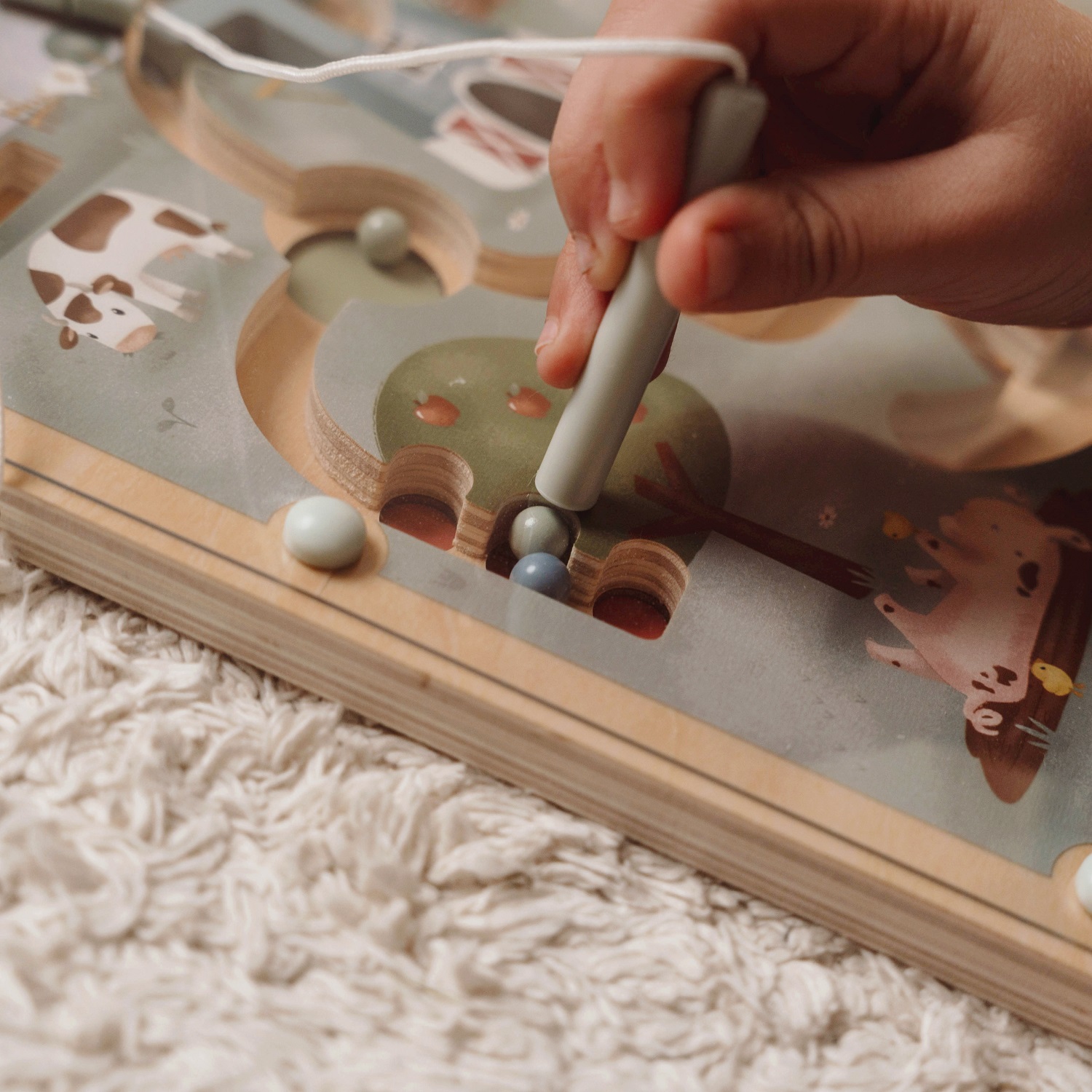 Doskonała gra zręcznościowa, która została stworzona do rozwijania umiejętności motorycznych najmłodszych dzieci w trakcie zabawy. Dzieci są zachęcane do przejścia całego labiryntu kuleczkami za pomocą dołączonego do zestawu rysika. Chwyć jedną lub więcej kulek za pomocą odpowiedniego rysika i przenieś je w wybrane miejsce. Możesz na przykład przenieść wszystkie niebieskie kulki do stawu, a czerwone do jabłoni. Po drodze możesz napotkać przeszkody, takie jak obracające się koło traktora i żagle wiatraka. Ta zabawka stymuluje koordynację ręka-oko i doskonale rozwija umiejętności motoryki małej.