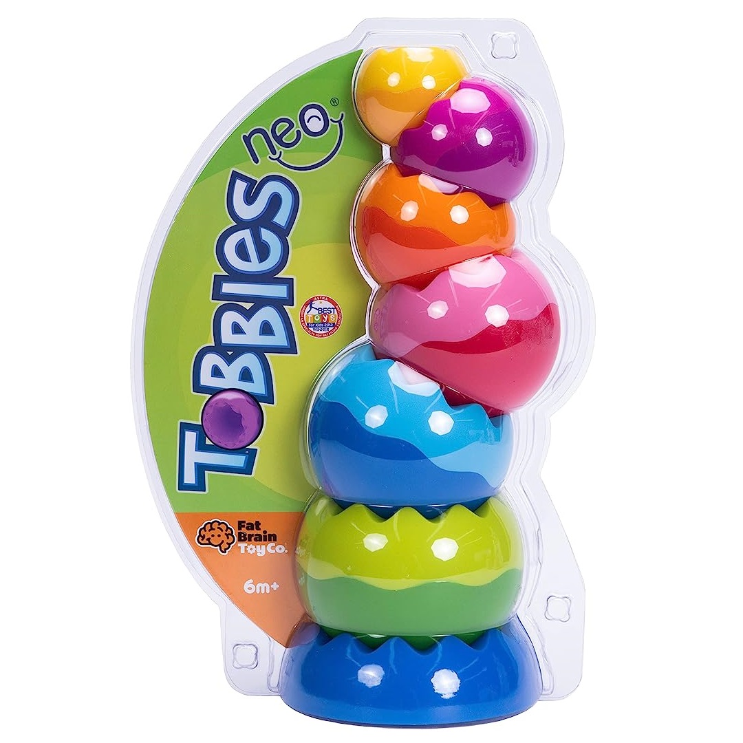 Tobbles Neo to niezwykle kolorowa układanka - piramida składająca się z sześciu elementów w kształcie kul z wgłębieniami, w które zawsze mieści się mniejsza kula. Z elementów można utworzyć piramidę i ustawić ją na dołączonej do zestawu podstawce. Każdy z elementów jest idealnie wyważony, dzięki czemu wprawiony w ruch wpada w lekkie kołysanie. Balansujące półkule fascynują malucha i zachęcają do eksperymentowania z klockami. Wspaniałe kolory pobudzają i inspirują do zabawy. Tobbles doskonalą koordynację ręka-oko, a także koordynację ruchową i wzrokową, a nawet świadomość przestrzenną. Ta niezwykła piramida to dynamiczna zabawka z nieograniczonymi możliwościami.