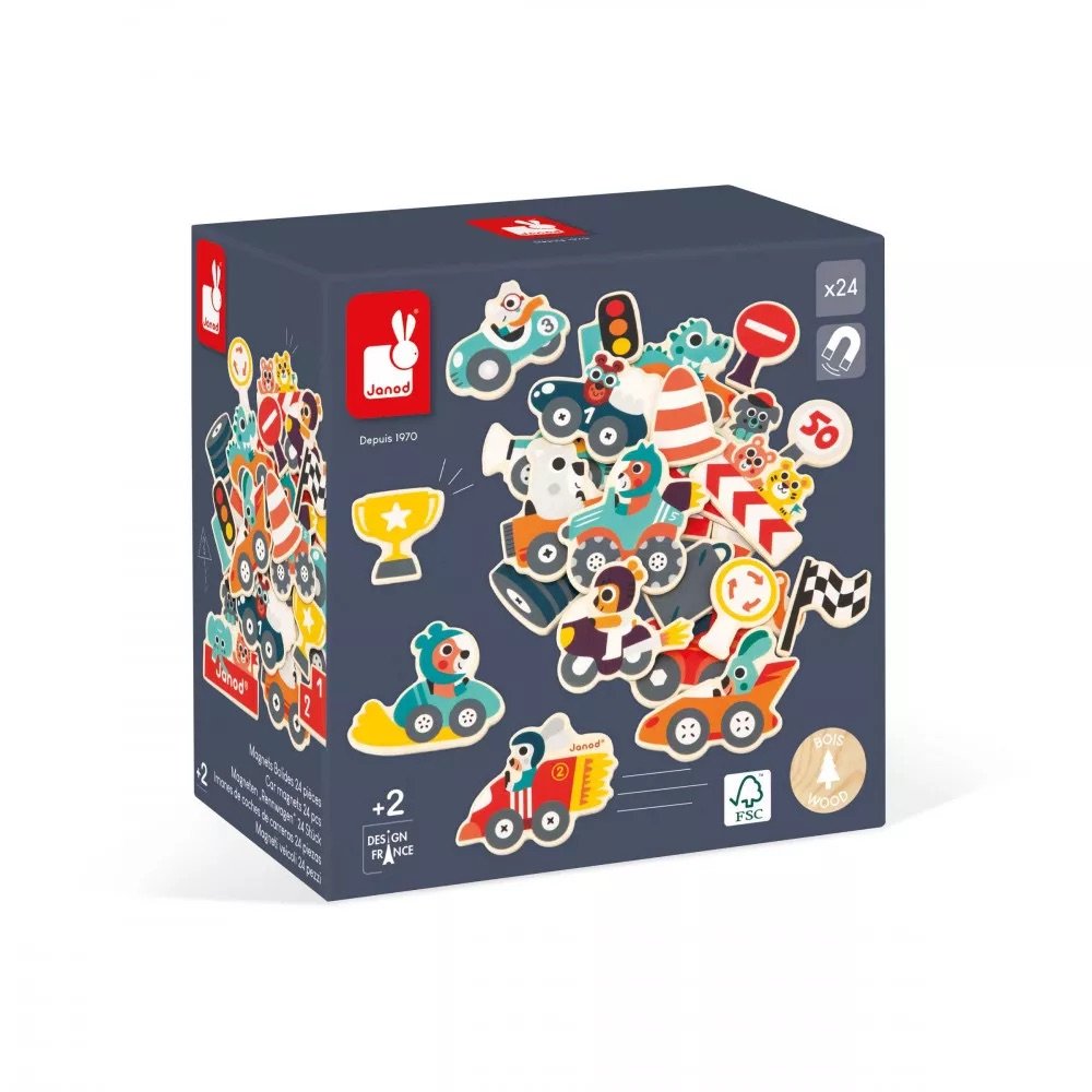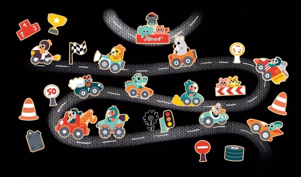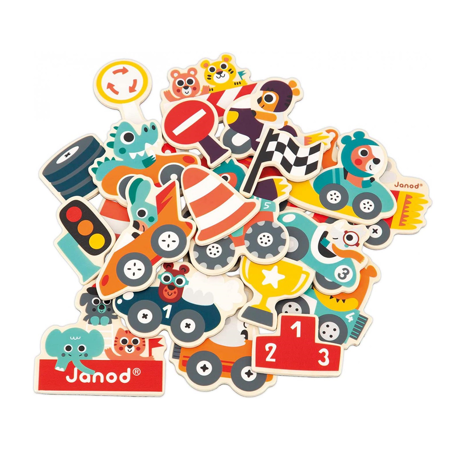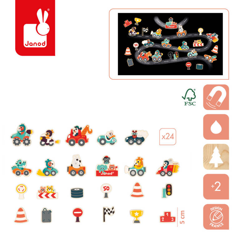 Zestaw drewnianych magnesów Pojazdy francuskiej marki JANOD to wspaniały prezent dla kilkulatka. Komplet zawiera 24 magnesy o wielkości ok. 5-7 cm, nawiązujące do tematyki wyścigów samochodowych: są tu bolidy, prowadzone przez zwierzęta, holownik, podium, trofeum, opony, kanister, flaga, znaki drogowe, pachołki ostrzegawcze, sygnalizacja świetlna oraz kibice – wszystkie elementy mają ciekawy design i intensywne, energetyzujące barwy. Magnesy te ze względu na jakość wykonania będą służyły przez długie lata, a zabawa nimi od najmłodszych lat rozwija wyobraźnię i zdolności manualne. Zestaw może stanowić uzupełnienie każdej tablicy magnetycznej.