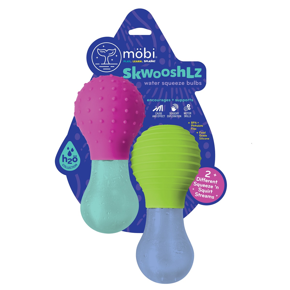 Dwie zabawki kąpielowe - bańki do pryskania wodą od marki Mobi. Odkręć bańkę, nalej wodę, zakręć, naciśnij na miękką bańkę i zobacz jak tryska woda. Bańki mają różne otwory po to, by woda różnie wypływała. Świetna zabawa sensoryczna do wody i nie tylko. Bańki wykonane są z wysokiej jakości silikonu.