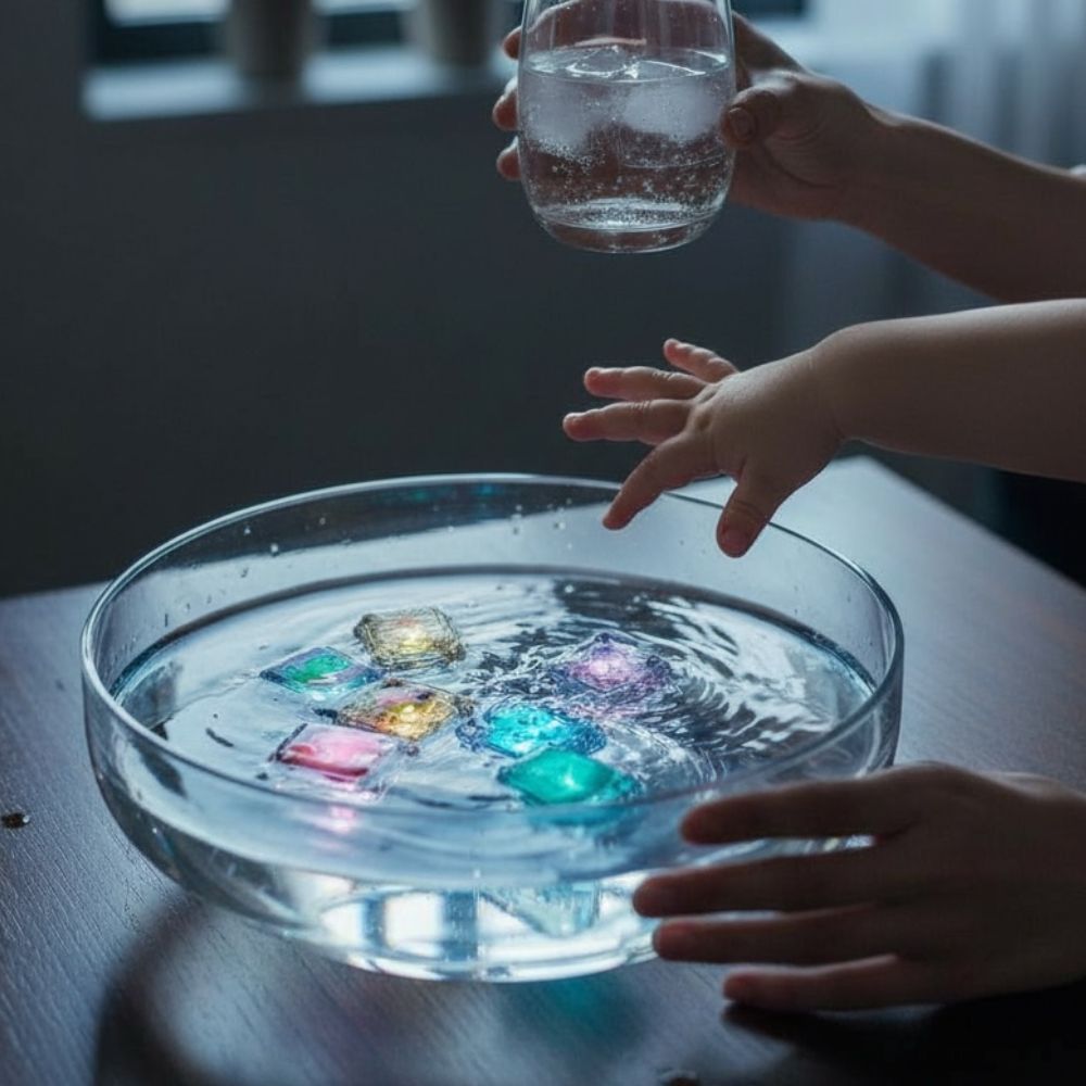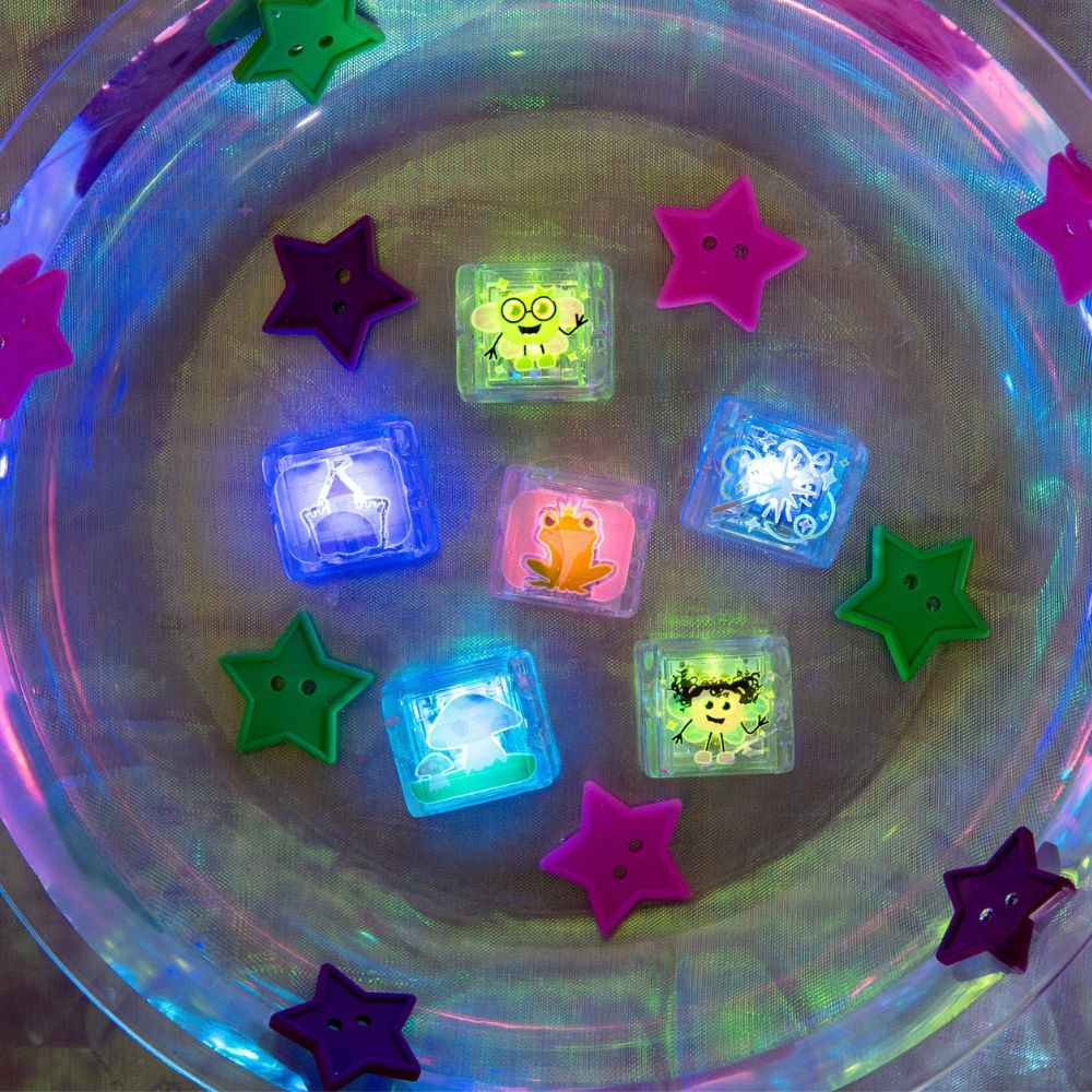 Zabawka, która urozmaici kąpiel Twojego dziecka! Będzie również idealnym dodatkiem do zabaw sensorycznych stymulujących bodźce wzrokowe! Włóż kostkę Glo Pals do słoika z wodą, dodaj kolorowe elementy takie jak wstążki, kulki i stwórz butelkę sensoryczną lub kolorową lampkę do namiotu czy bazy.