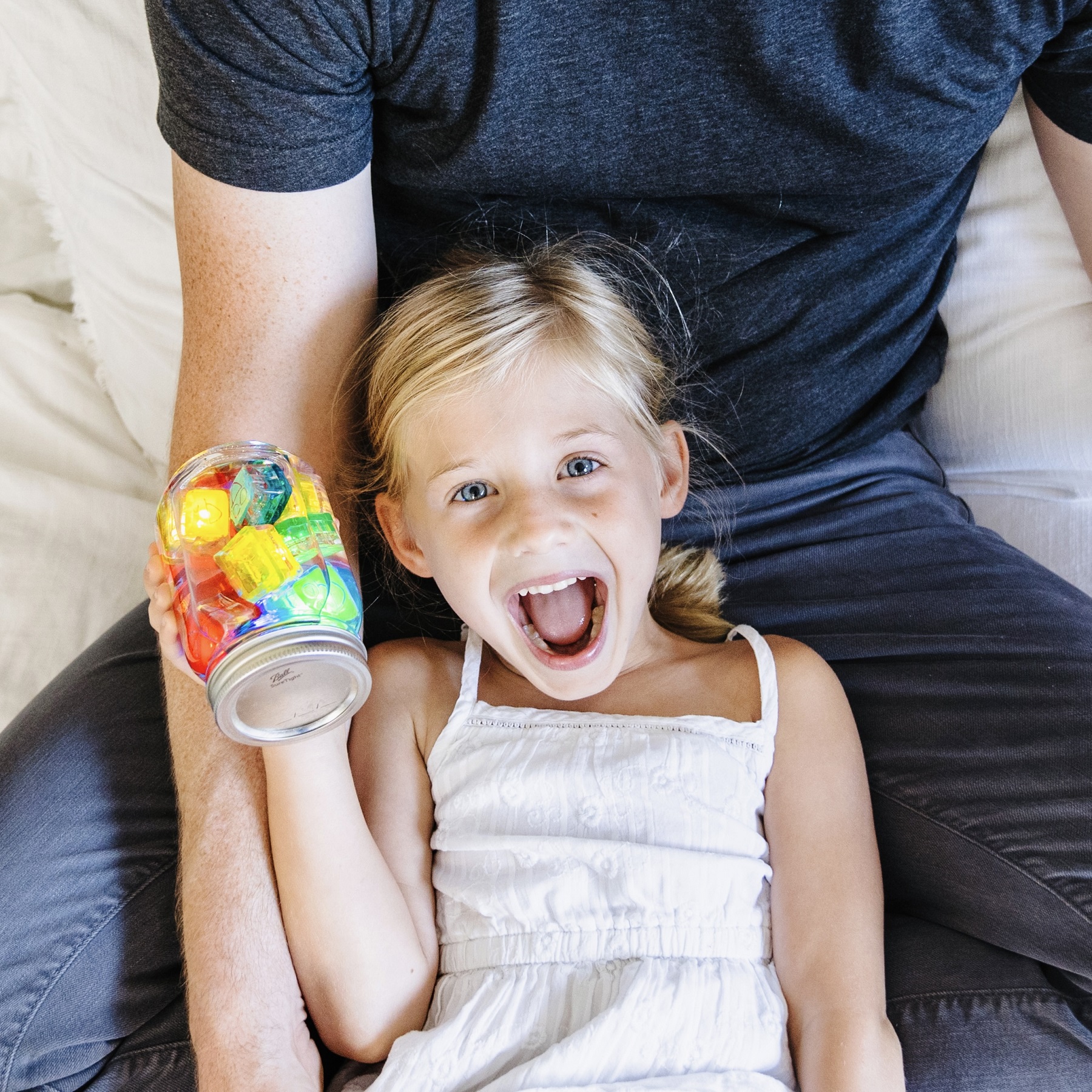 Dzięki świecącym kostką możesz zrobić lampion. Wystarczy, że weźmiesz słoik, wlejesz wody i umieścisz kolorowe kostki. Poruszaj słoikiem i obserwuj jak zmienia się światło.
