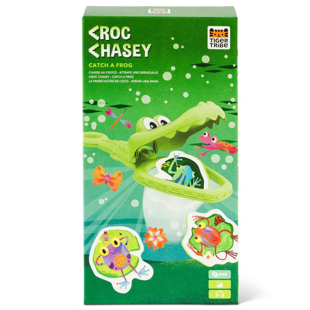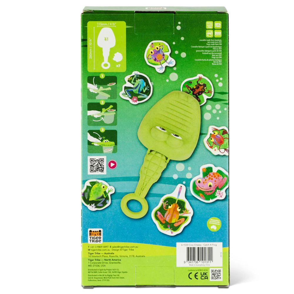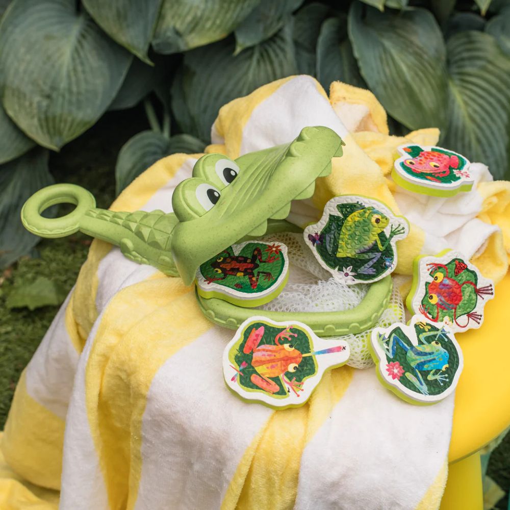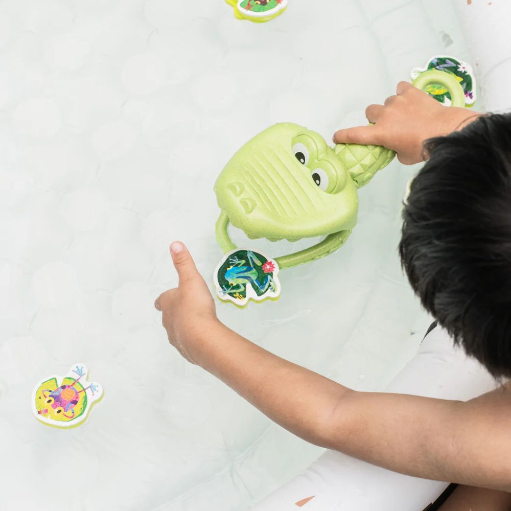 Zabawki kąpielowe Złap Żabkę od Tiger Tribe to fantastyczny sposób, aby zamienić codzienną kąpiel w pełną śmiechu i ruchu przygodę! Dziecko, używając siatki w kształcie krokodyla, łowi unoszące się na wodzie piankowe żabki, ćwicząc przy tym zręczność i koordynację. To idealny pomysł na prezent dla 2-latka, który umili czas w wannie, a przy okazji wesprze rozwój motoryki małej i siły chwytu. Ekologiczne wykonanie z bioplastiku sprawia, że zabawka jest bezpieczna dla dzieci i przyjazna dla środowiska.