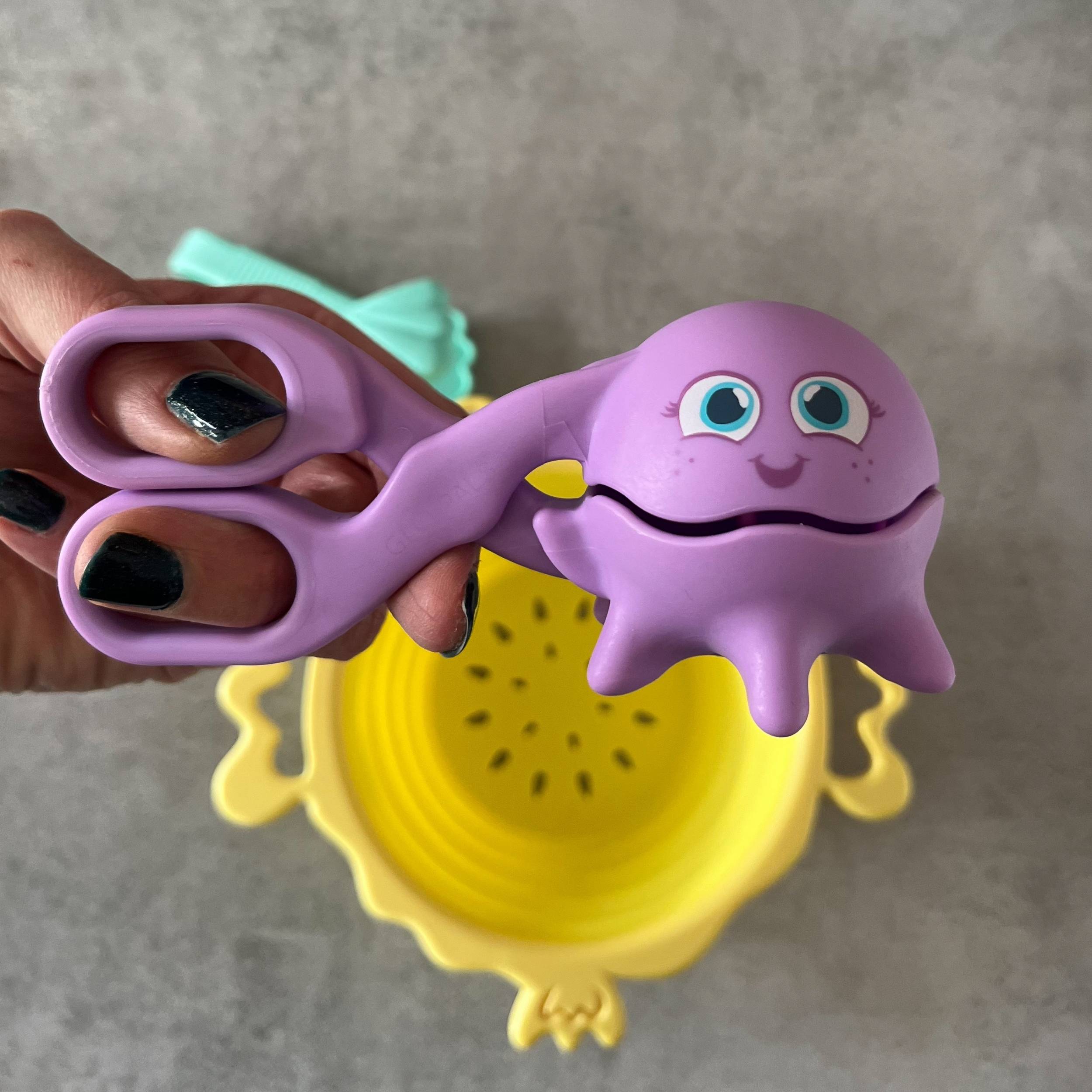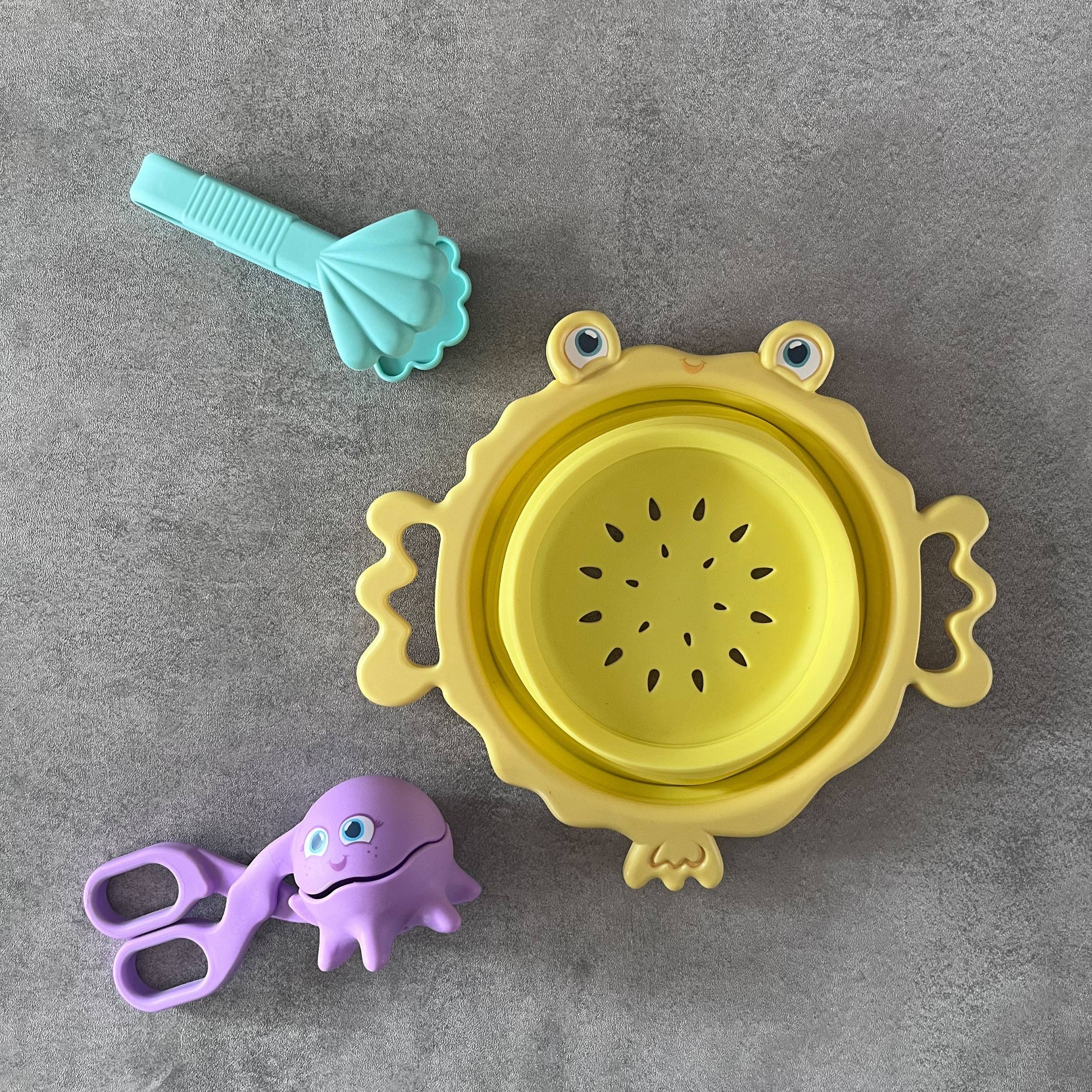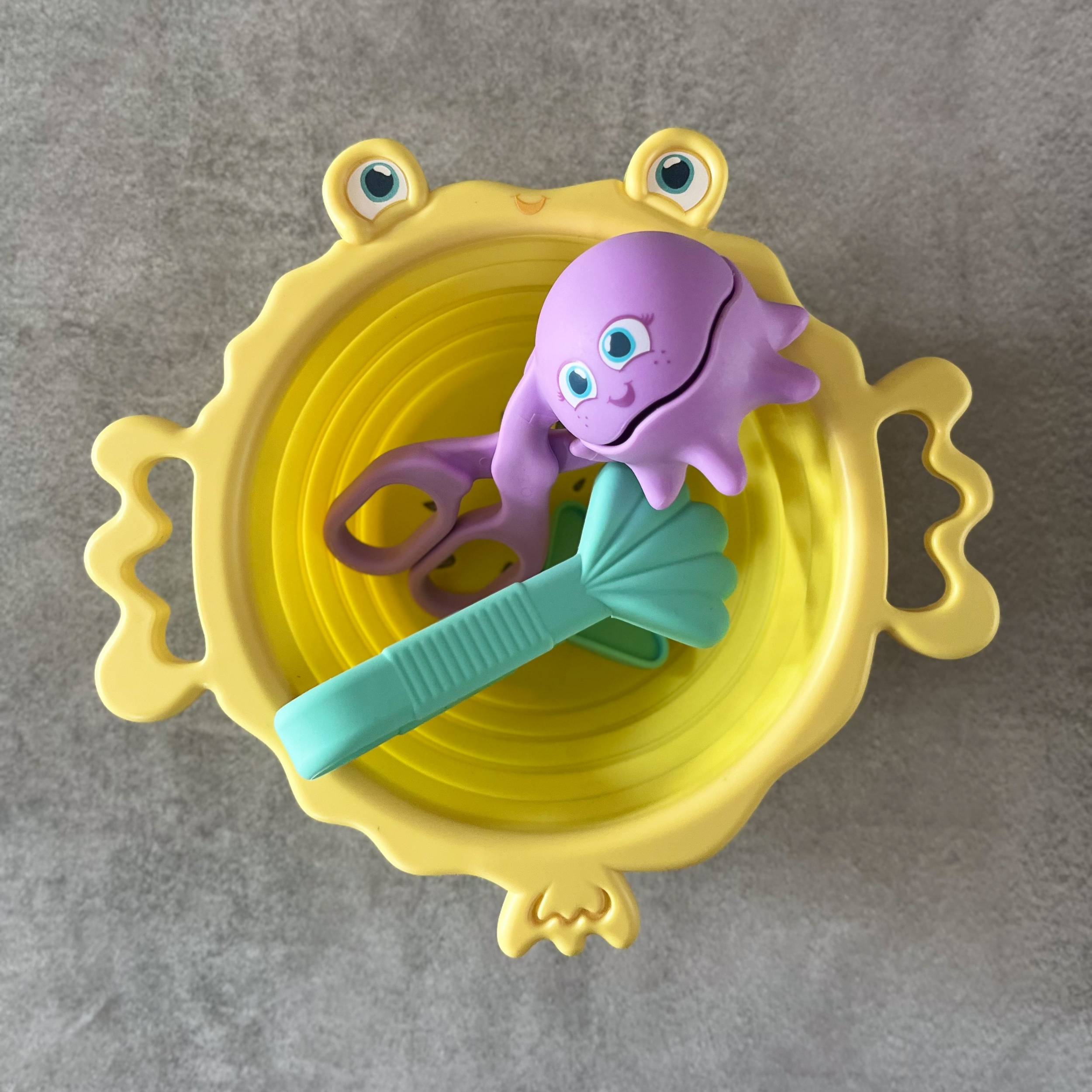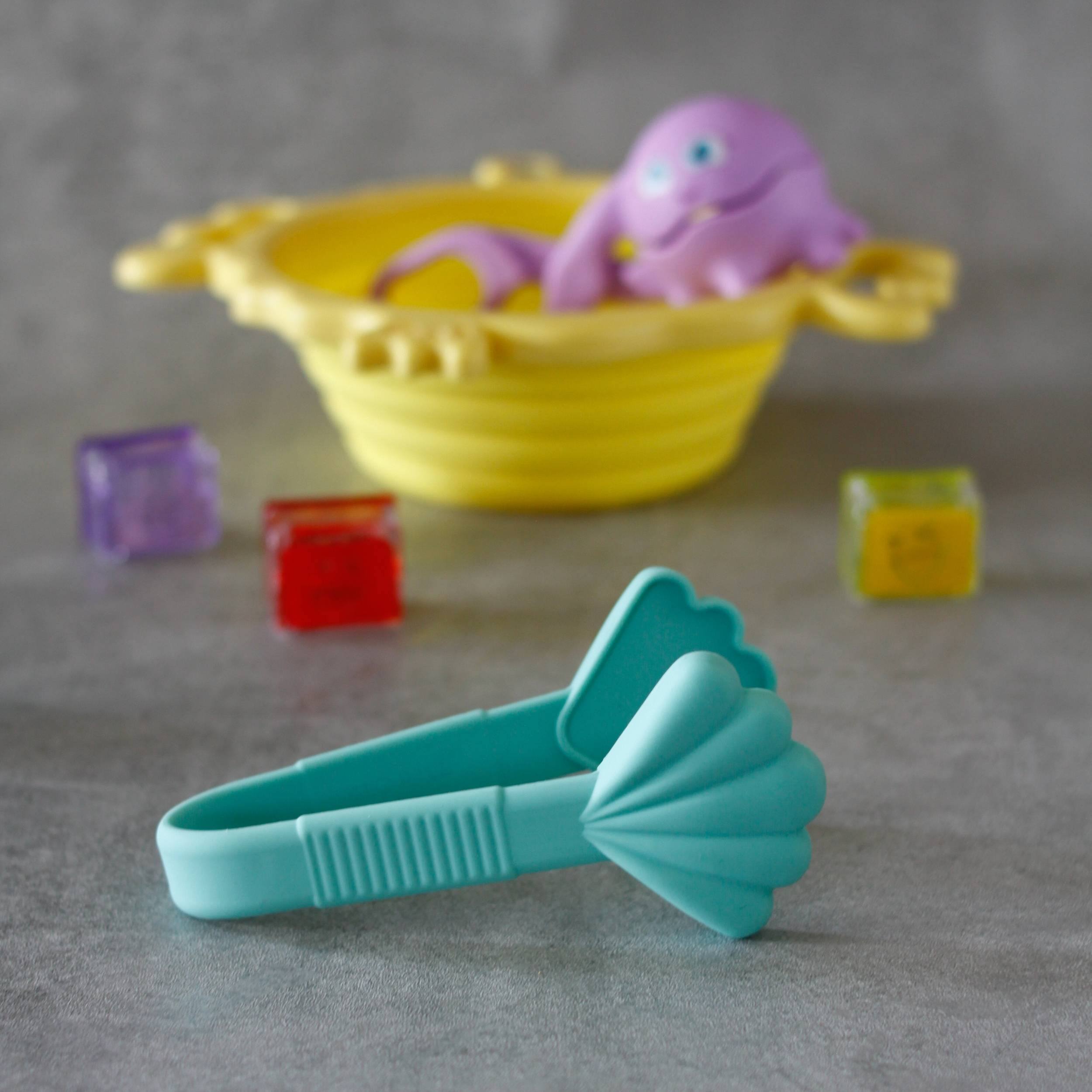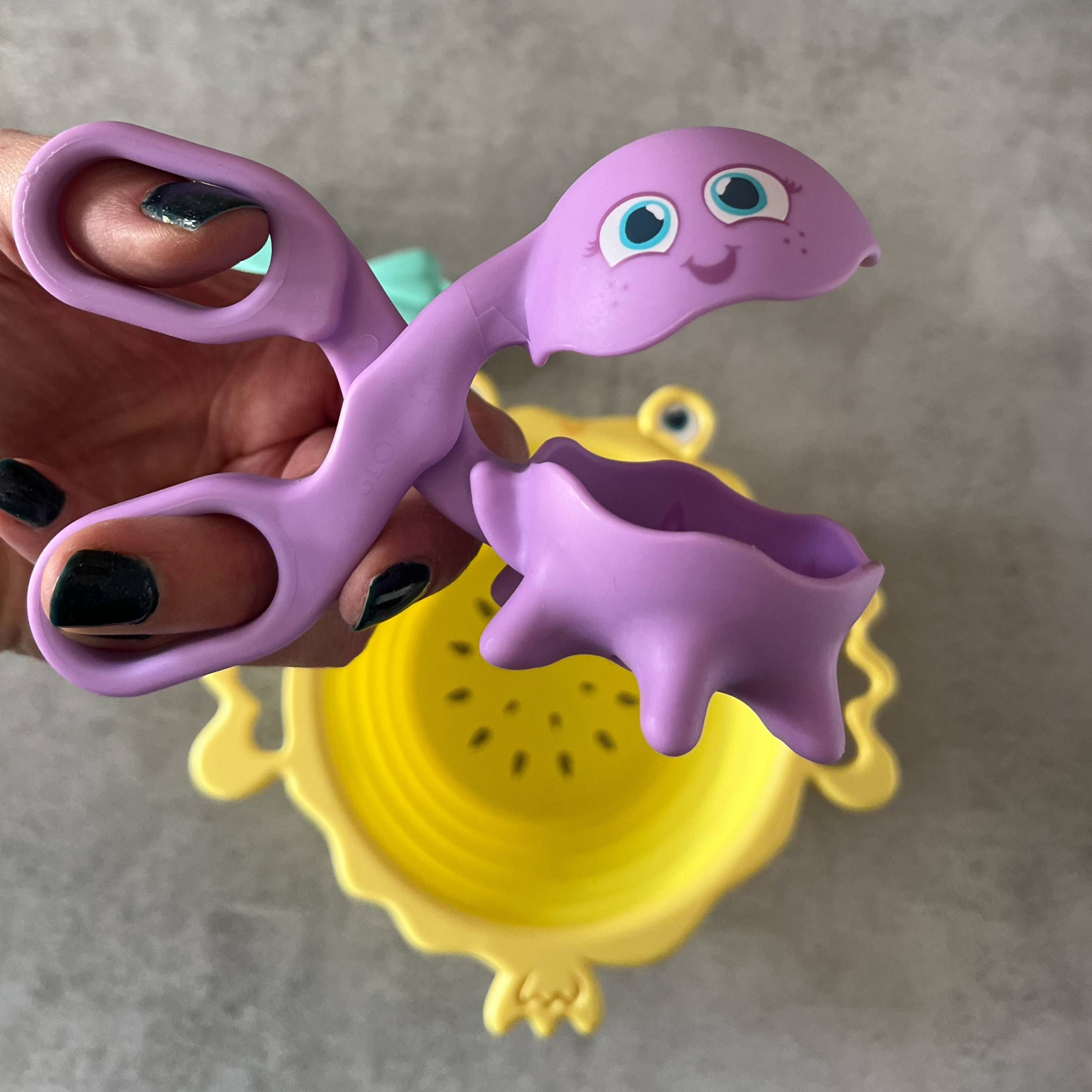 W zestawie mamy: rozkładane sitko, chwytak - kałamarnica (chwytak możemy rozłączyć i mieć dwa oddzielne akcesoria!) oraz szczypce w kształcie muszli.
