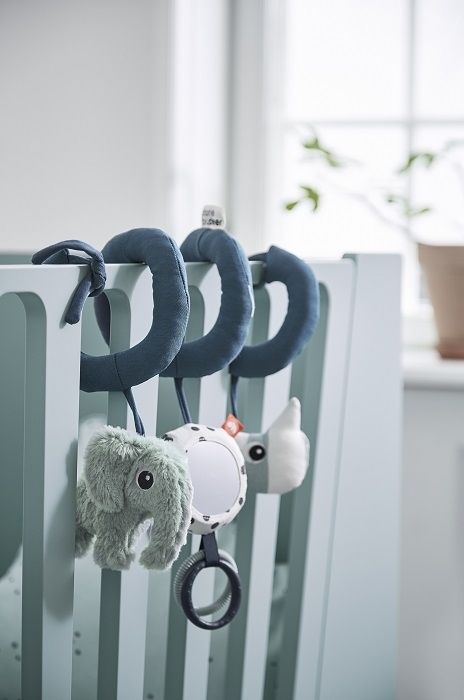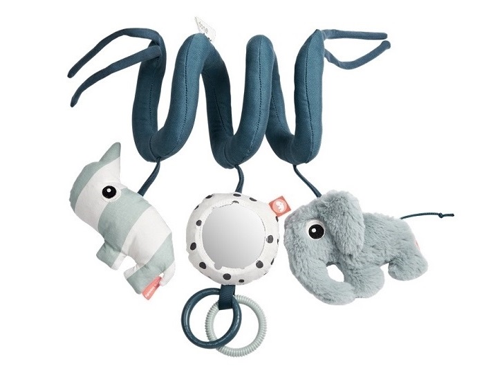 Zawieszka do wózka, łóżeczka bądź fotelika została wykonana z miękkich i przyjemnych w dotyku materiałów. Każdy z elementów spirali posiada inną funkcję: miękki pluszowy słonik Elphee zachwyci Malucha słodkim grzechotaniem. Ozzo przyjemnie szeleści, a małe lusterko jest idealne dla ciekawskich oczu. Kółeczka o różnej strukturze przyniosą ulgę podczas ząbkowania. Zawieszki dołączone do spirali rozwijają zdolności motoryczne, ułatwiają chwytanie i przyciągają uwagę dziecka.