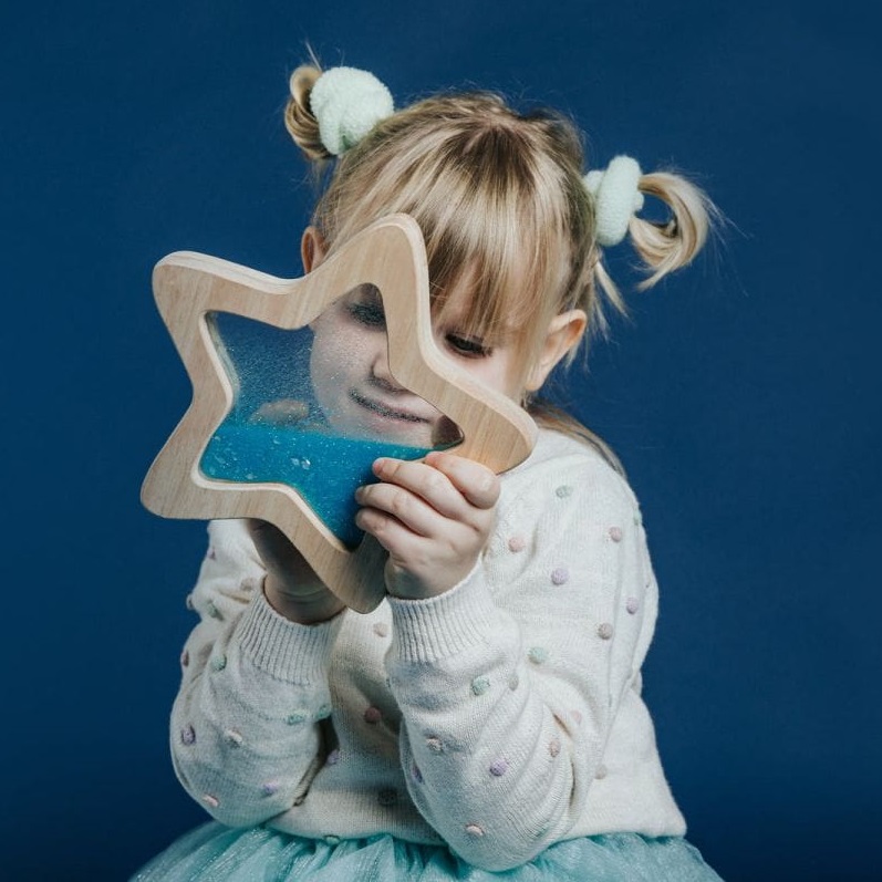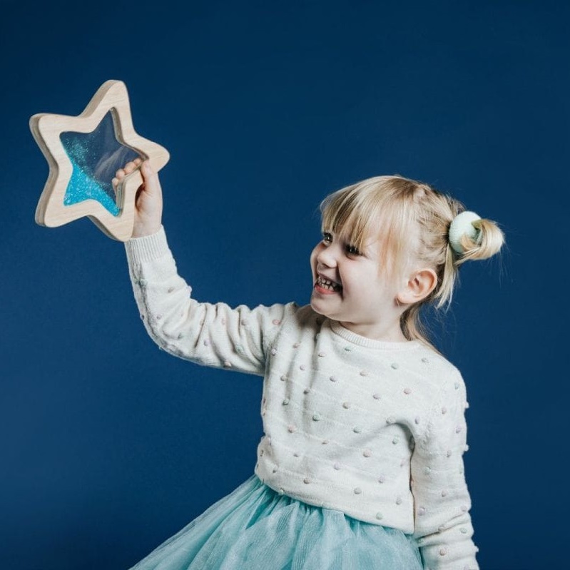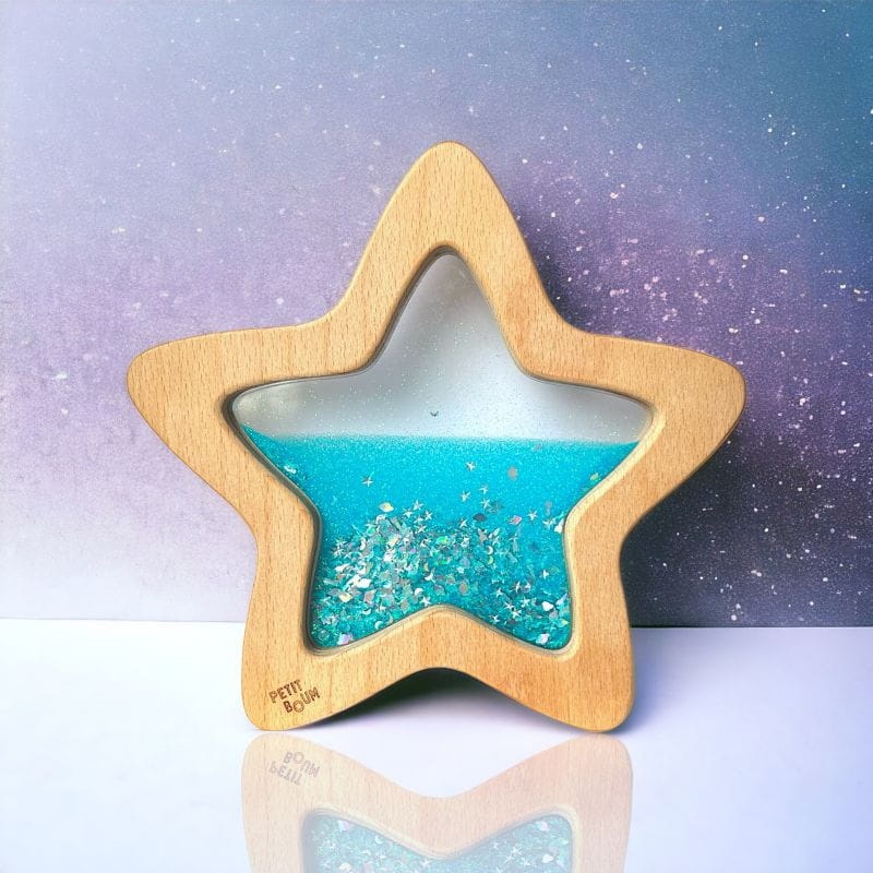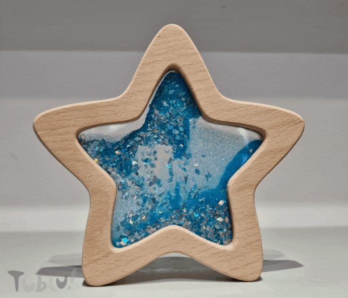 Całość wykończono starannie wyszlifowanym drewnem, co nie tylko zwiększa walory estetyczne produktu i pozytywnie wpływa na trwałość zabawki, ale także sprawia, że produkt jest niezwykle przyjemny w dotyku. Gwiazda przepływowa to piękna mieszanka brokatu i piasku fluorescencyjnego, które połyskują w połączeniu ze światłem. Spróbuj naświetlić gwiazdę, a odkryjesz niewidoczne wcześniej gwiazdki fluorescencyjne wirujące w brokatowym płynie. To zdecydowanie efekt WOW, który zachwyci dzieci i rodziców!
