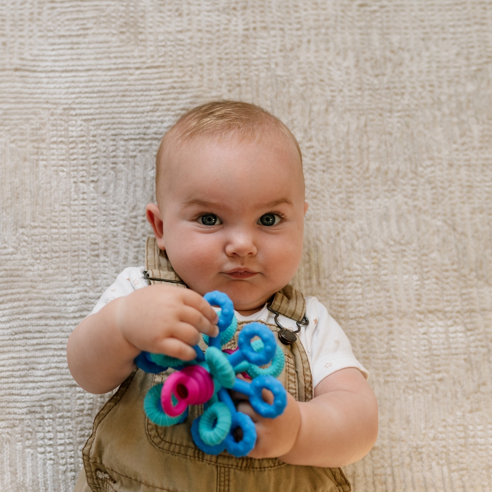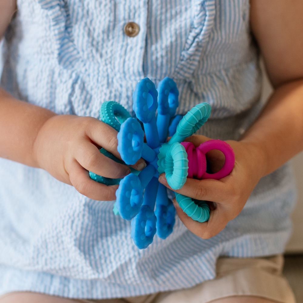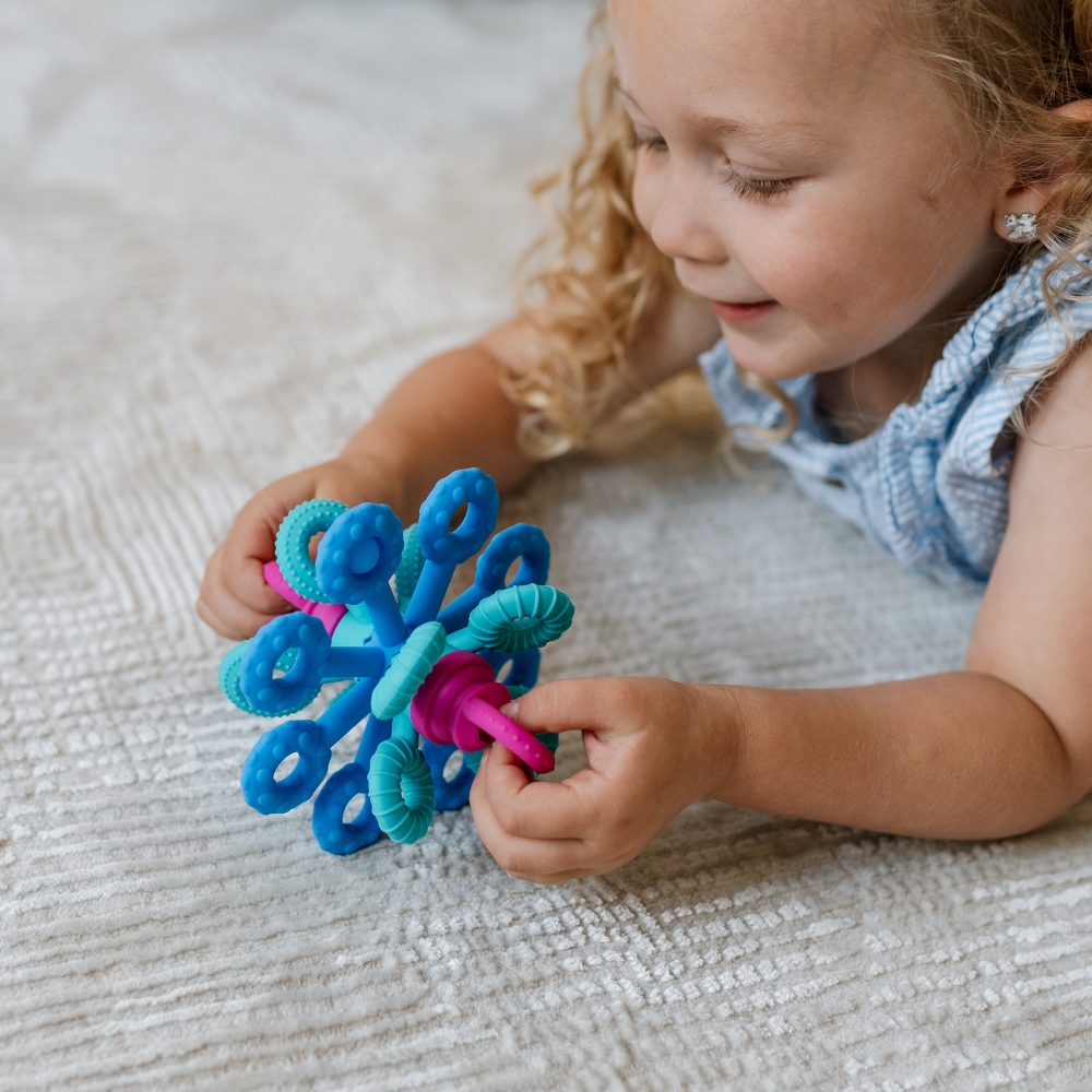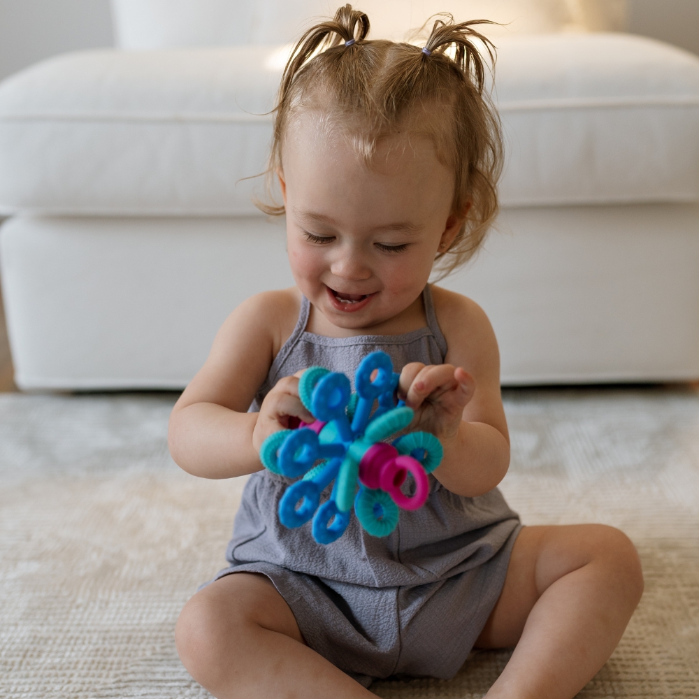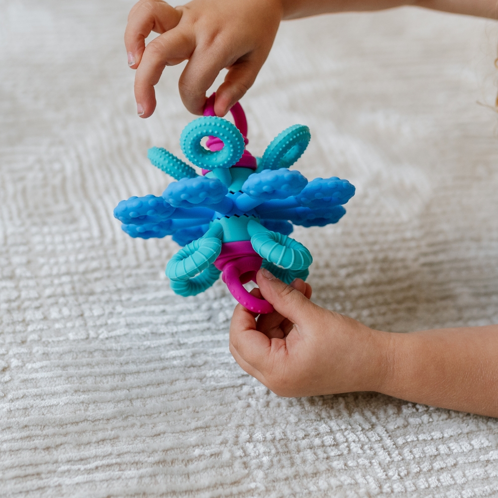 Okee ma aż 18 elastycznych ramion i trzy ruchome pierścienie o ząbkowanych krawędziach, które podczas obracania delikatnie wibrują. Różnorodne kolory i struktury stymulują wzrok oraz dotyk, a miękki, bezpieczny silikon sprawia, że zabawka idealnie nadaje się również jako gryzak. Dla najmłodszych to sposób na pierwsze eksperymenty sensoryczne, a dla starszych – świetna zabawka typu fidget, pomagająca się skupić i wyciszyć.