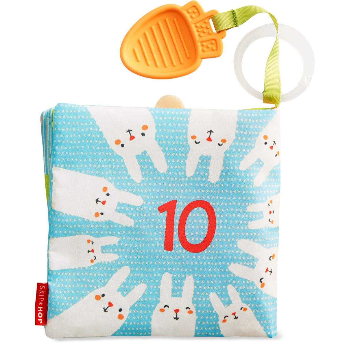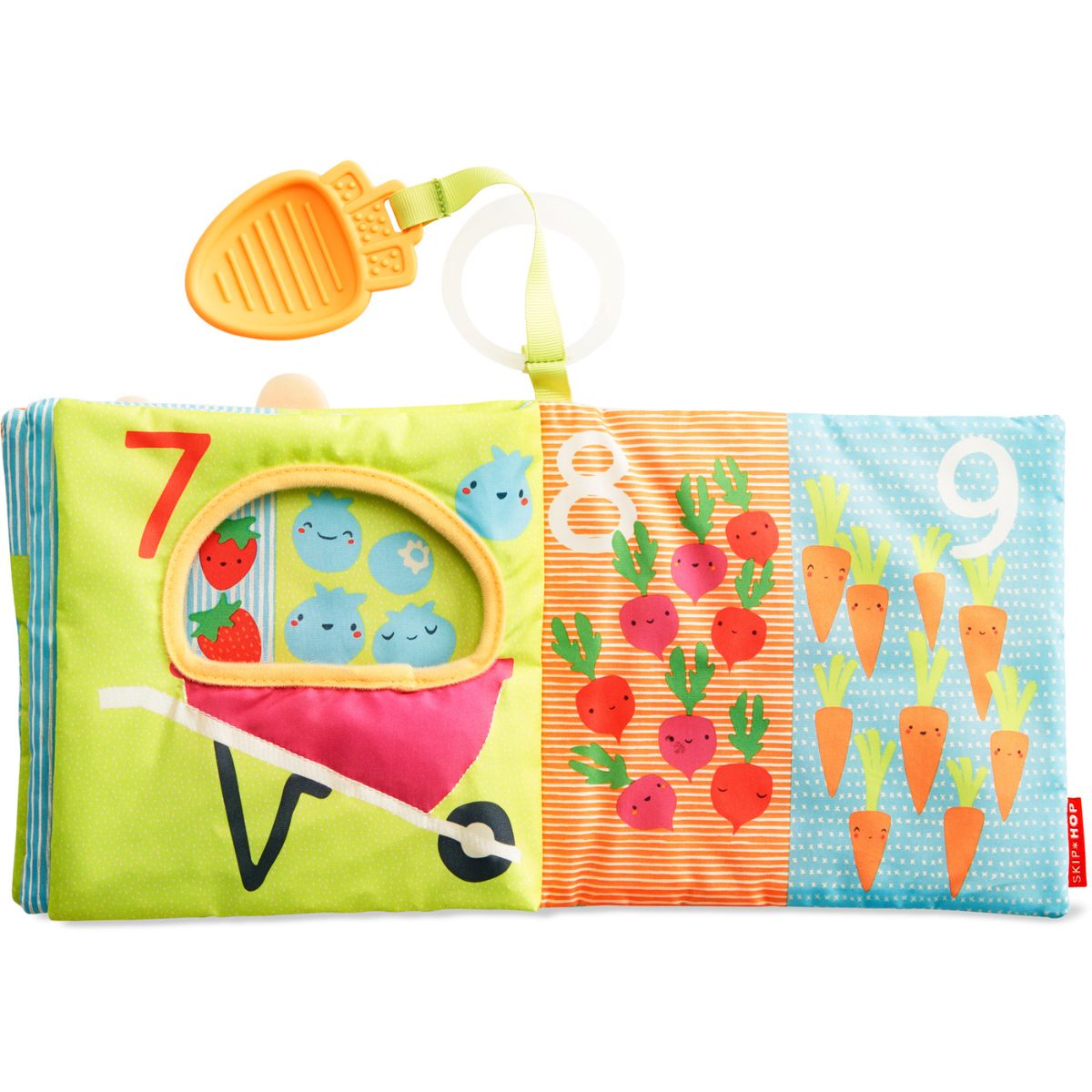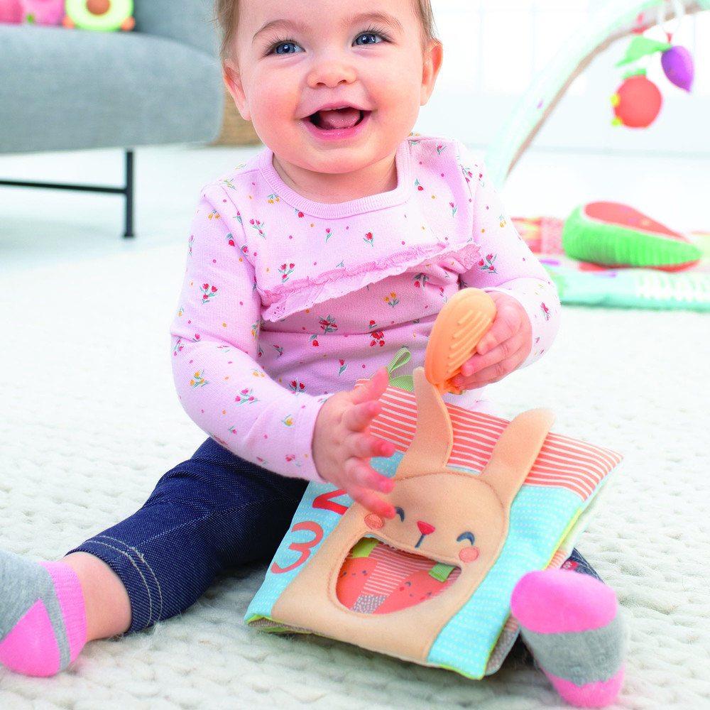 Książeczka pełna angażujących aktywności dla dziecka. Oprócz pięknych kolorowych stron posiada gryzak w postaci marchewki, piszczałkę w pyszczku królika, szeleszczące strony, bezpieczne lusterko, wystające metki oraz grzechotkę wbudowaną w jedną ze stron. Gryzak można przekładać przez otwór pierwszej strony „karmiąc” króliczka i ćwicząc przy tym małe paluszki. Każda ze stron zadrukowana jest obrazkami warzyw i zwierzątek oraz liczb odpowiadających ich ilościom. Książeczka posłuży w późniejszym czasie do nauki liczenia!