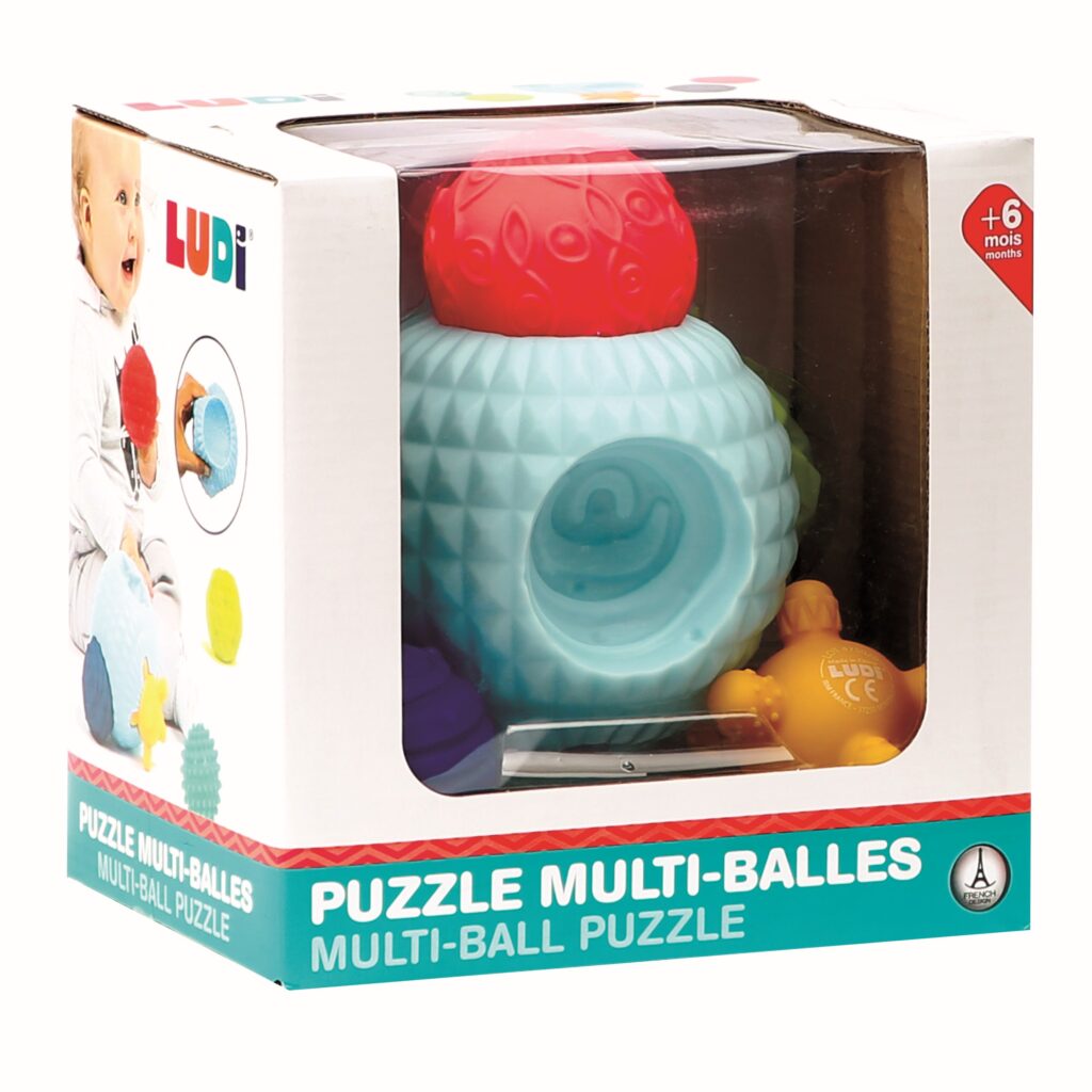 Zabawka marki Ludi składa się z jednej dużej kuli oraz pięciu mniejszych piłek o różnorodnych kolorach, kształtach i teksturach. Dzieci świetnie się bawią odłączając małe kulki od dużej, a następnie mają za zadanie wpasować piłeczki we właściwe miejsca. Ich elastyczne tworzywo jest odporne na gryzienie – przyniosą ulgę dziąsłom ząbkującego malucha.