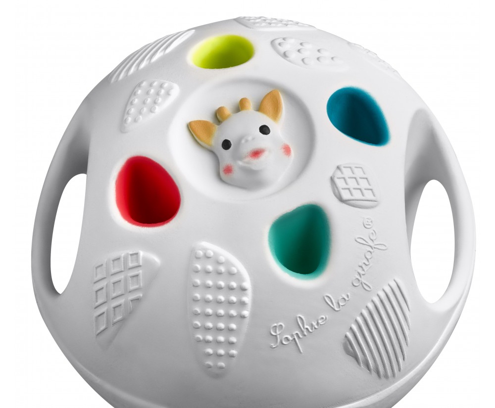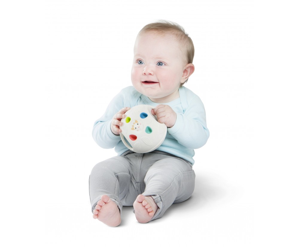 Wykonana w całości z kauczuku naturalnego! Jasne kolory, dołki i zróżnicowana tekstura (kropki, gwiazdki sieci…) mocno stymulują małą motorykę paluszków. Piłka jest lekka, miękka i ergonomiczna, bardzo łatwa do łapania dzięki dwóm zintegrowanym uchwytom. Nadaje się świetnie do zabawy i … gryzienia. Doskonałe remedium na swędzące dziąsła!