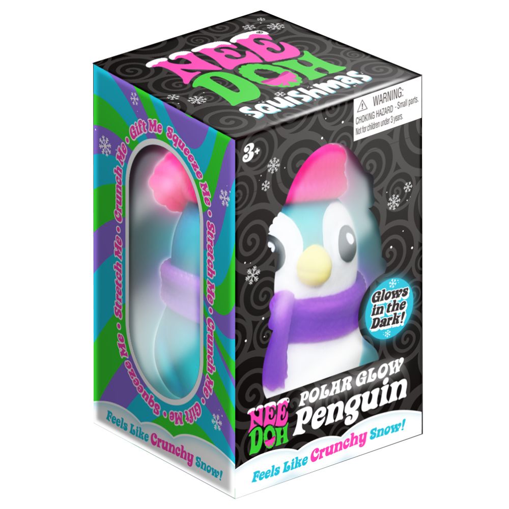 Świecący w ciemności pingwinek NeeDoh z chrupiącym, „śnieżnym” wypełnieniem.