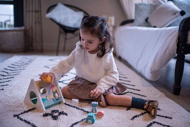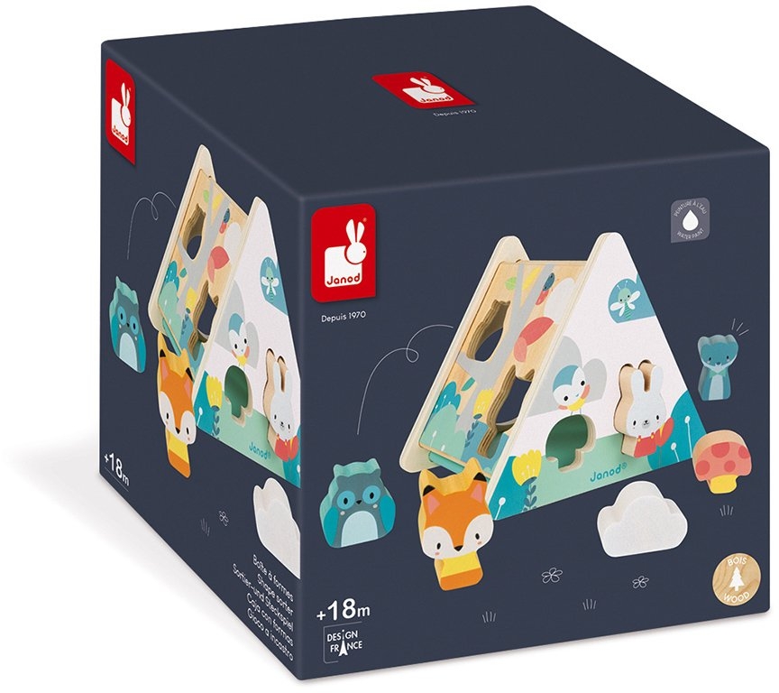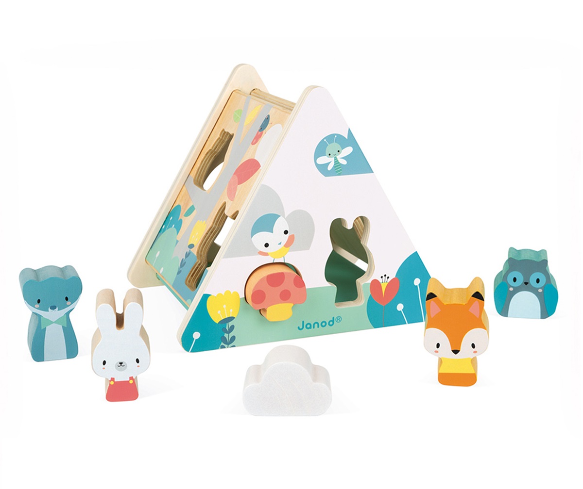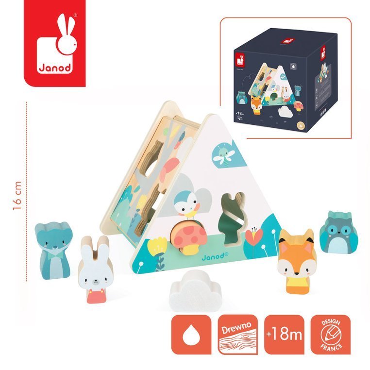 Sorter kształtów francuskiej marki Janod rozwija u dziecka wiele kluczowych umiejętności, m.in. rozróżnianie i dopasowywanie kształtów czy tzw. małą motorykę. Zabawka uczy koncentracji, spostrzegawczości, a także cierpliwości. Zestaw składa się z drewnianej bryły o bokach w kształcie trójkąta, na której ścianach znajduje się 6 otworów w różnych kształtach oraz 6 drewnianych klocków w kształtach, odpowiadającym wspomnianym otworom. Wrzucone klocki bardzo łatwo wyjąć ze środka, bo jeden bok sortera jest częściowo otwarty.
