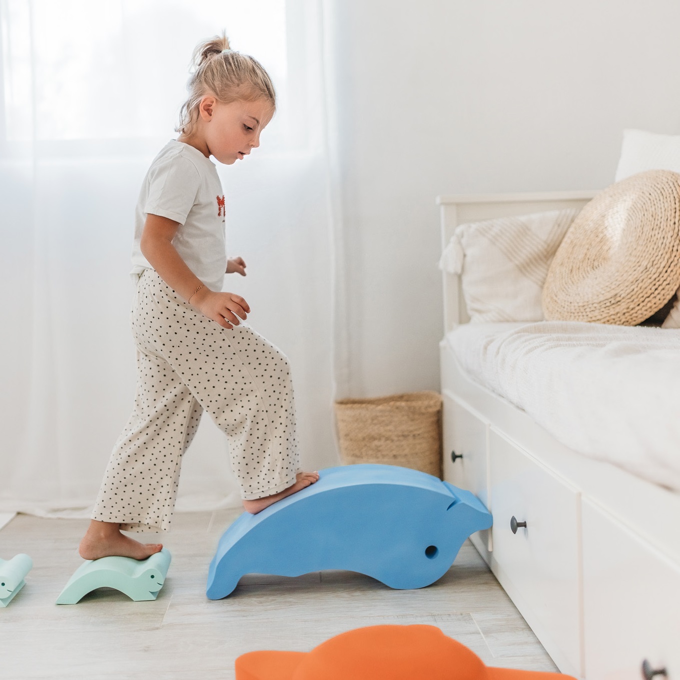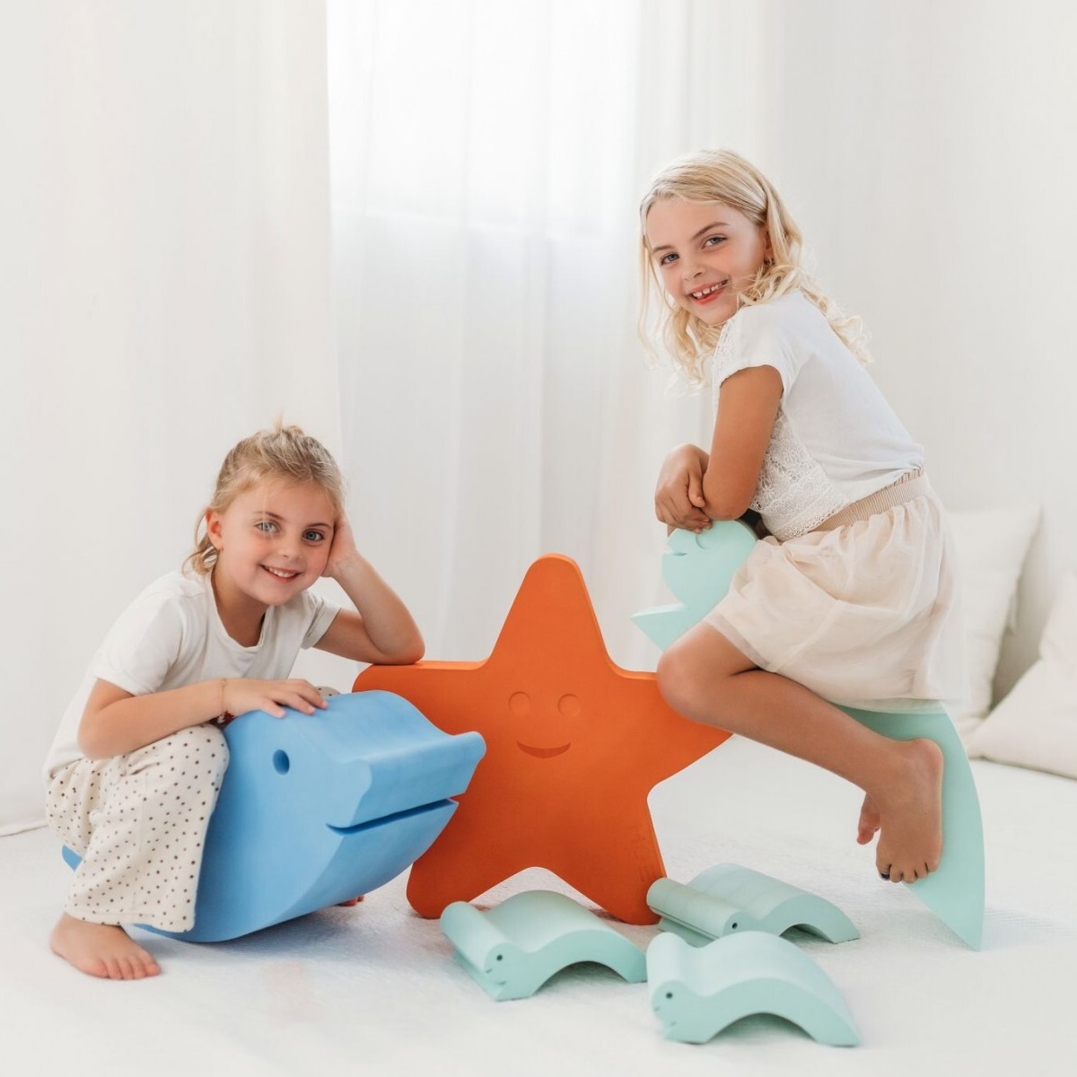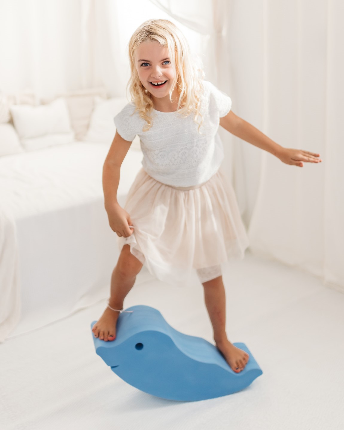 Zabawka delfin pozwala na aktywne spędzenie czasu na wiele sposobów. Zabawka może posłużyć jako zwykły bujak: dziecko siada na delfinie, rączkami przytrzymuje się uchwytów, możemy również podnieść poziom trudności i po odczepieniu uchwytów starać się utrzymać równowagę stając na delfinku. Odwracając go do góry nogami delfin może podłużyć jako element toru do przejścia. Na odwróconym delfinku dziecko może leżeć na brzuszku, a położony bokiem może pełnić rolę siedziska.