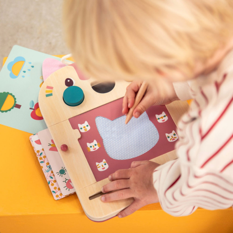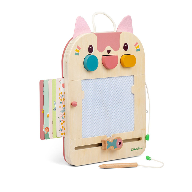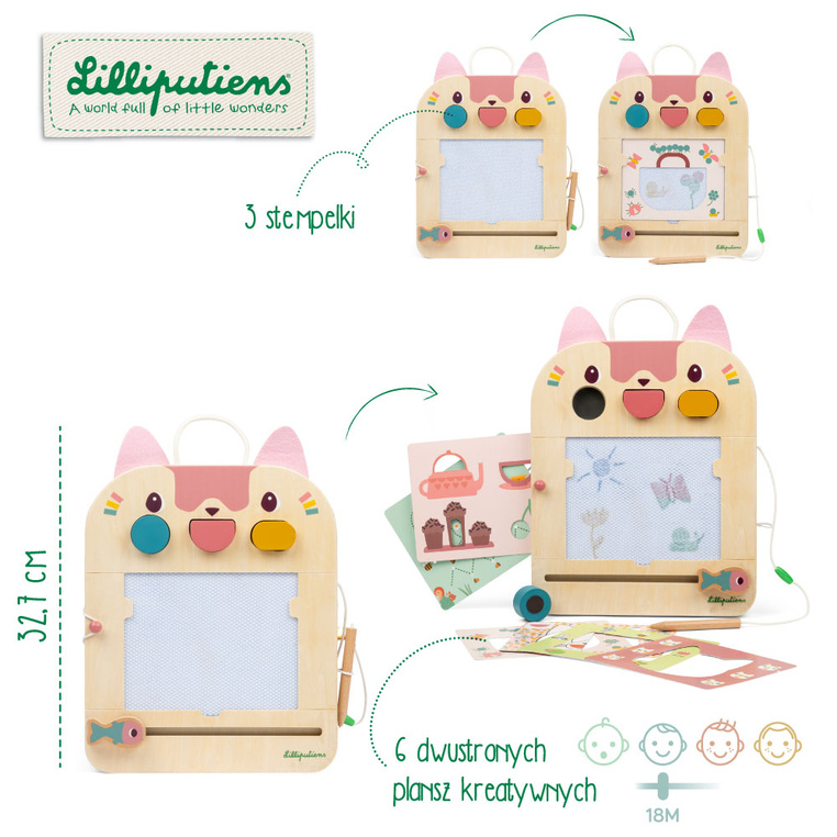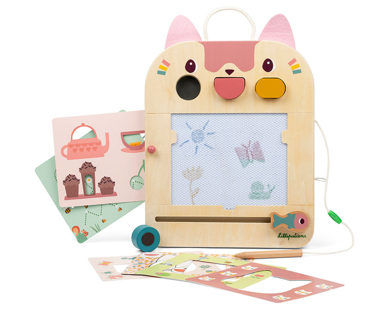 Drewniana tablica-znikopis Kotka Jeanne belgijskiej marki Lilliputiens to wspaniała zabawka edukacyjna, która łączy w sobie radość tworzenia i naukę poprzez zabawę. Dzięki niej dziecko może rysować, odciskać magnetyczne kształty i rozwijać swoje zdolności manualne, a gdy skończy – jednym ruchem rybki wyczyści ekran i zacząć od nowa. To nie tylko świetna rozrywka, ale też doskonałe ćwiczenie koordynacji ręka–oko, małej motoryki i wyobraźni.