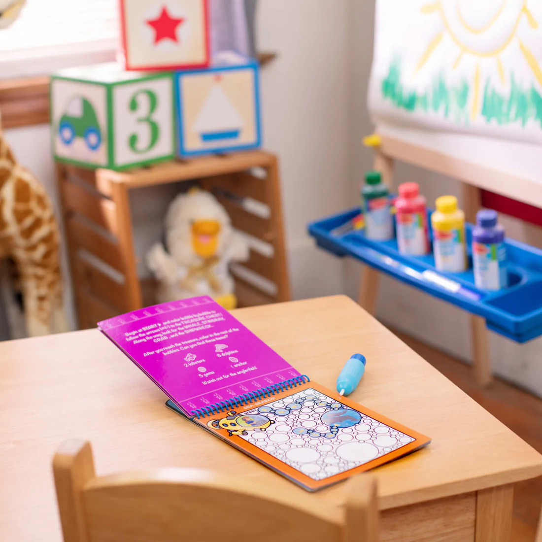 Malowanie bez kredek i farb? To możliwe z kolorowanką wodną Water Wow Melissa & Doug. Odrobina wody sprawi, że obraz małego artysty zacznie nabierać kolorów. Zestaw zawiera kolorowankę z planszami wielokrotnego użytku oraz specjalny pędzelek. Pędzelek należy napełnić wodą przed zabawą. Będzie on ją aplikował przy naciskaniu nim na plansze kolorowanki. Każda strona to inne wzory i kolory, które pojawiają się po zwilżeniu. Kiedy Twój obrazek wyschnie, możesz zacząć zabawę od nowa.