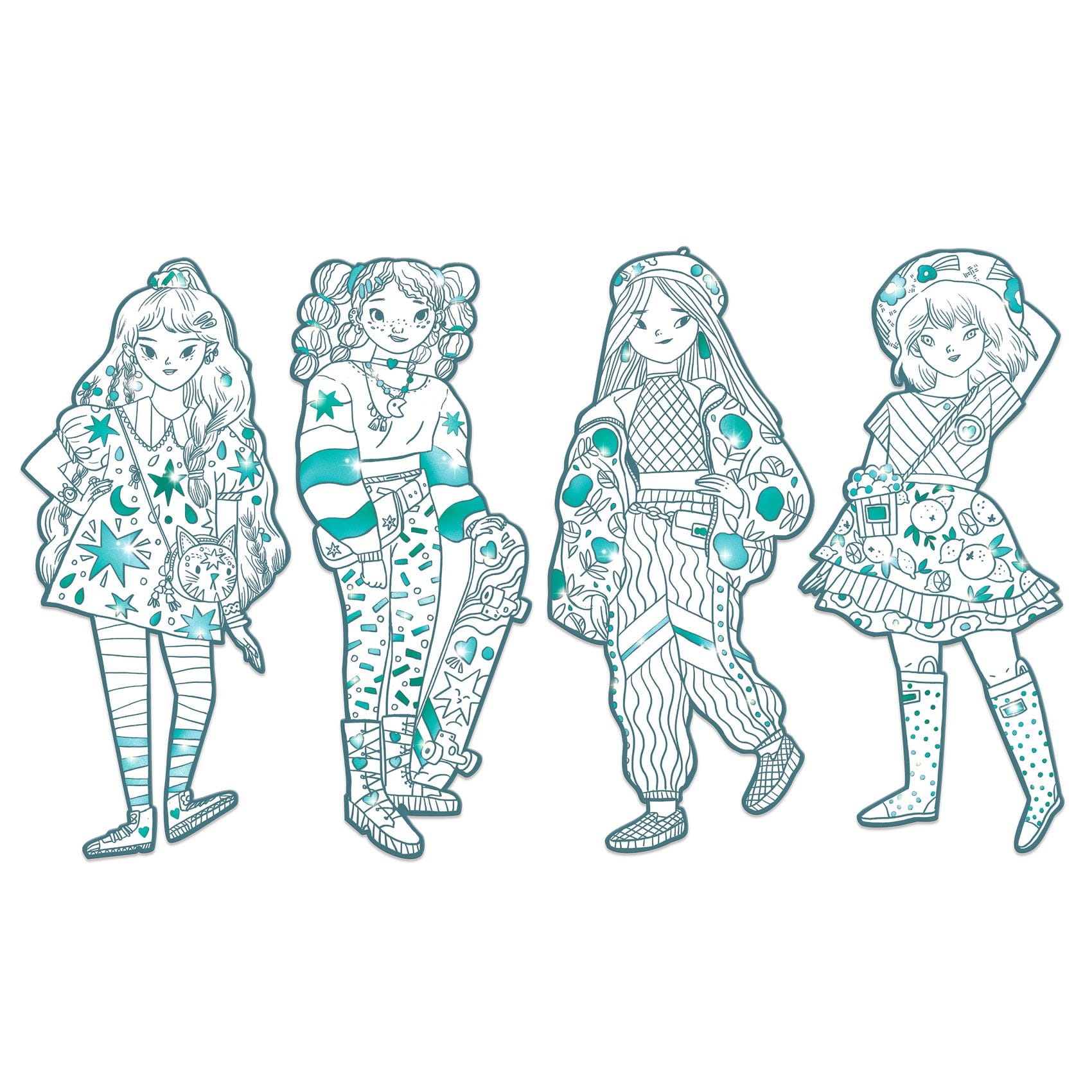 Zestaw postaci do kolorowania Djeco. Angele i jej przyjaciółki są gotowe na pokaz mody! Wzorzyste ubrania czekają na końcową wizję projektanta. W zestawie cztery duże kolorowanki (32 cm) z metalicznymi zdobieniami, które nadają dodatkowego szyku modelkom. Wykonane z papieru i kartonu posiadającego certyfikat FSC®.