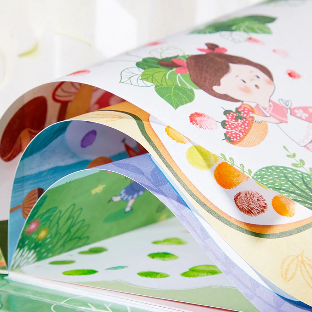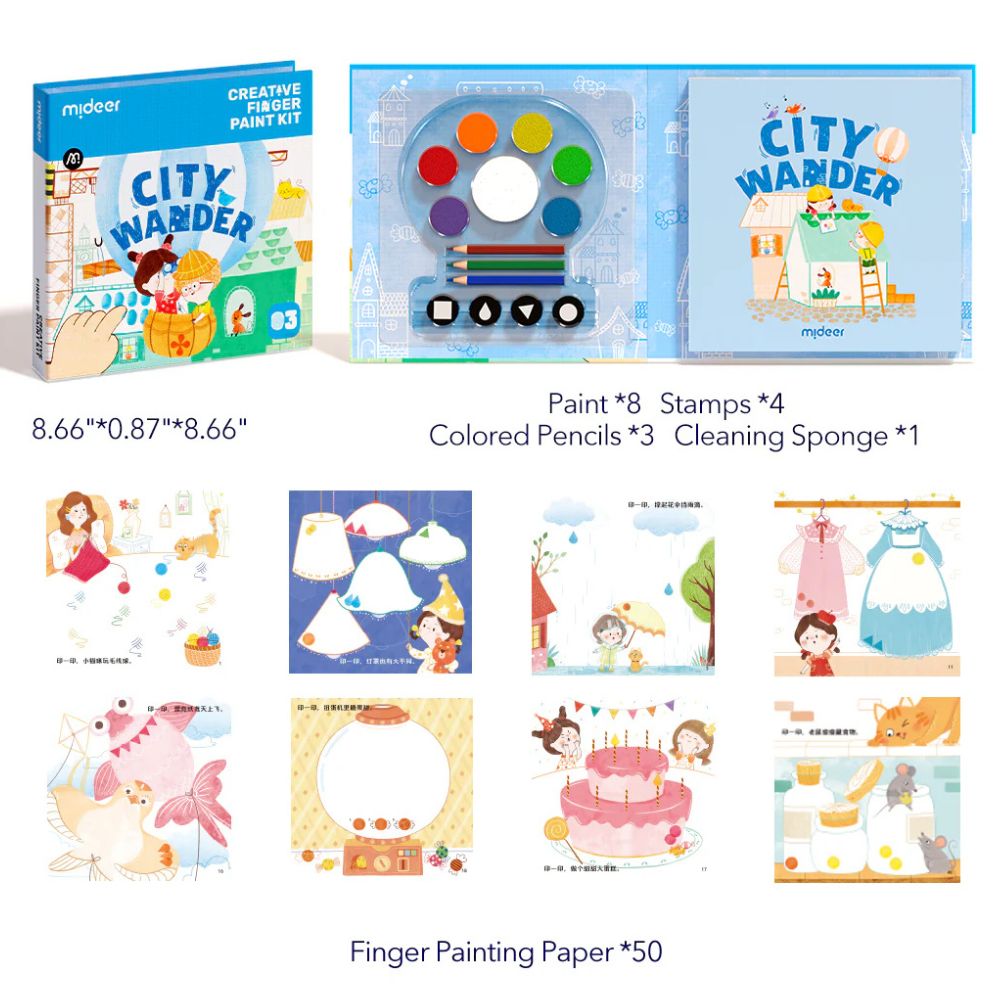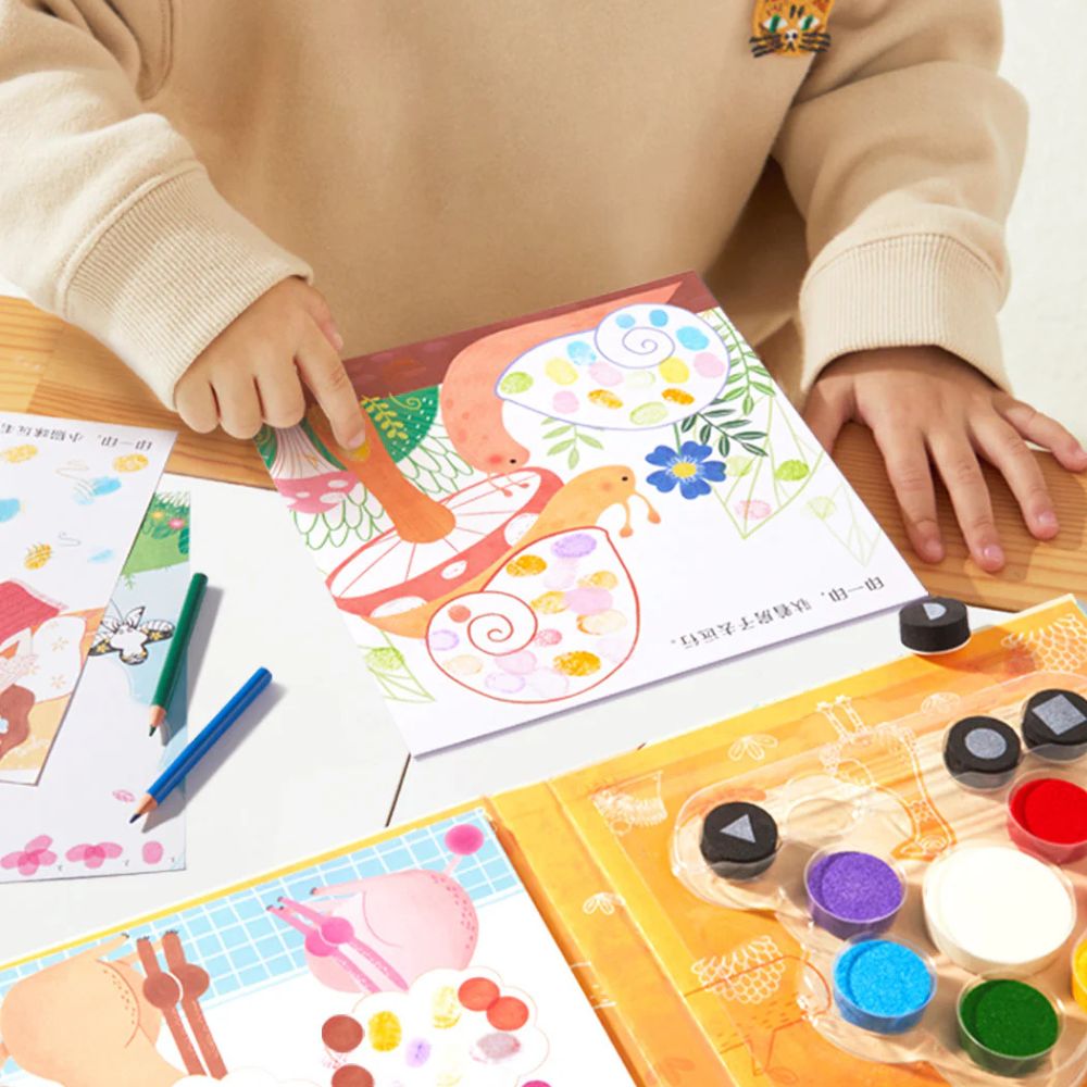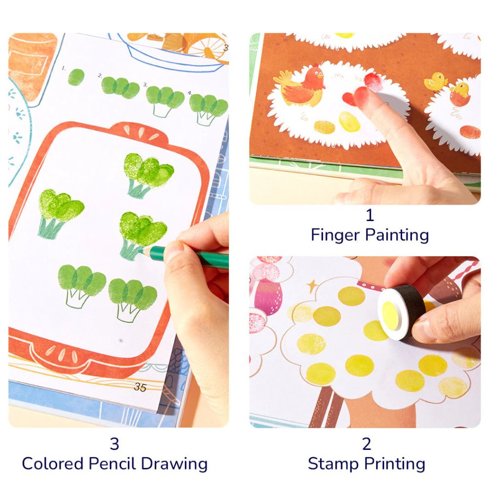 Zestaw do malowania palcami to świetny wybór dla każdego początkującego artysty i dla każdej początkującej artystki. Każda ze stron została zaprojektowana tak, aby można było ją łatwo otworzyć i skupić się tylko na tworzeniu. Obrazki nawiązujące do roślin, zwierząt i jedzenia świetnie wpasują się w poznawanie codzienności przez najmłodszych malarzy. Zestaw ten zawiera również pieczątki w różnych kształtach, będące dodatkowym narzędziem do twórczego wyrażania siebie. Po zabawie, doprowadzenie artysty do porządku, na szczęście jest bardzo proste.