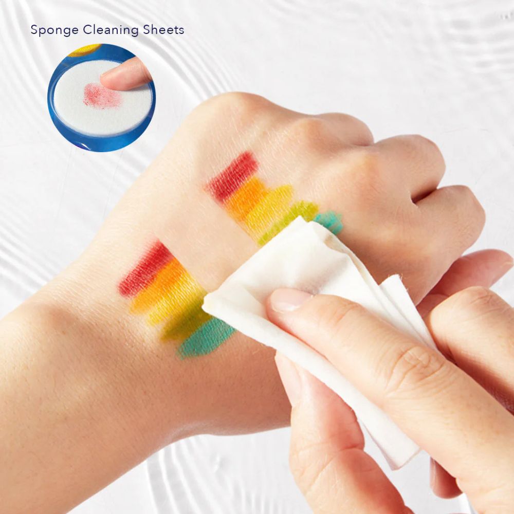 Zestaw zawiera: 8 pigmentów, 4 stemple, 3 kredki, 1 gąbkę do czyszczenia, 50 arkuszy