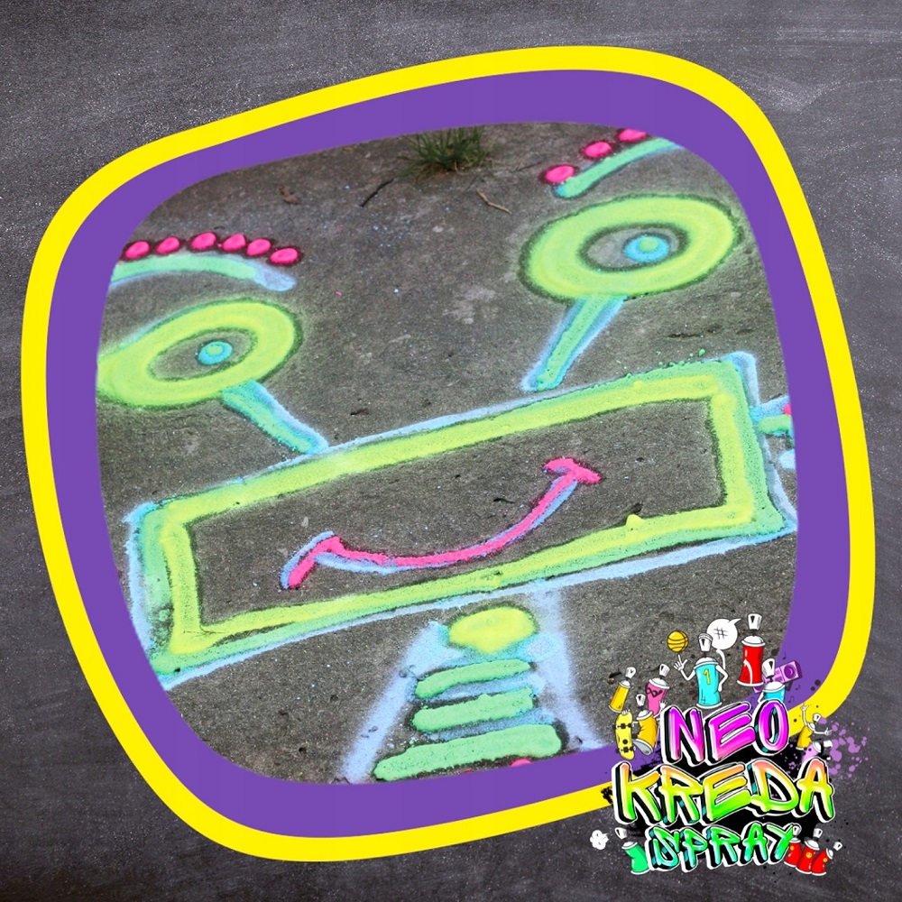 Kreda w sprayu znakomicie nadaje się do kreatywnych działań. Pomalujesz nią takie powierzchnie jak szkło, asfalt, drewno, kamienie czy trawa. NEO KREDA daje taki sam efekt jak farba w sprayu, ale w odróżnieniu od niej, jest zmywalna wodą. Należy wziąć pod uwagę, że wykonane nią malunki na zewnątrz pomieszczeń, zostaną także usunięte wraz z deszczem lub innym opadem atmosferycznym.