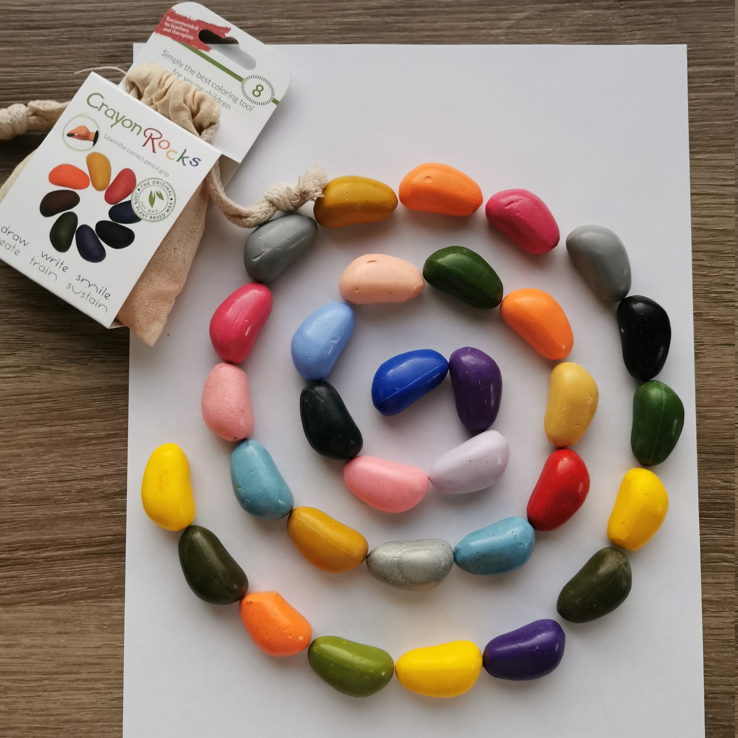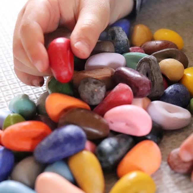 Crayon Rocks to doskanała alternatywa dla tradycyjnych kredek. Wyglądem i kształtem przypominają kamyki, co zmusza malucha do opowiedniego trzymania kredki. Dlatego też wykorzystywane są przez terapeutów. "Kamyki" są wykonane w 100% z wosku z soi, dzięki temu są całkowicie naturalne i bezpieczne dla środowiska.