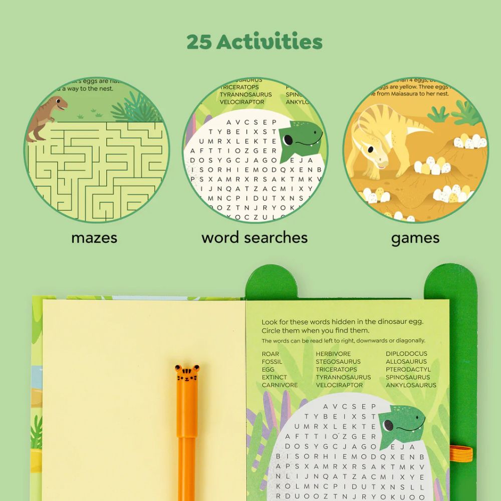 W środku znajdziesz 25 stron pełnych różnorodnych zadań – labiryntów, zagadek, gier słownych i logicznych łamigłówek – wszystko z motywem uwielbianych przez dzieci dinozaurów.
