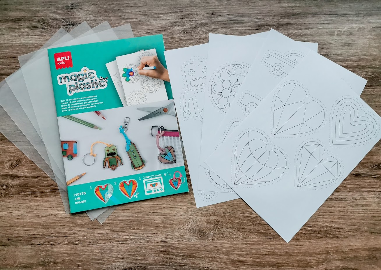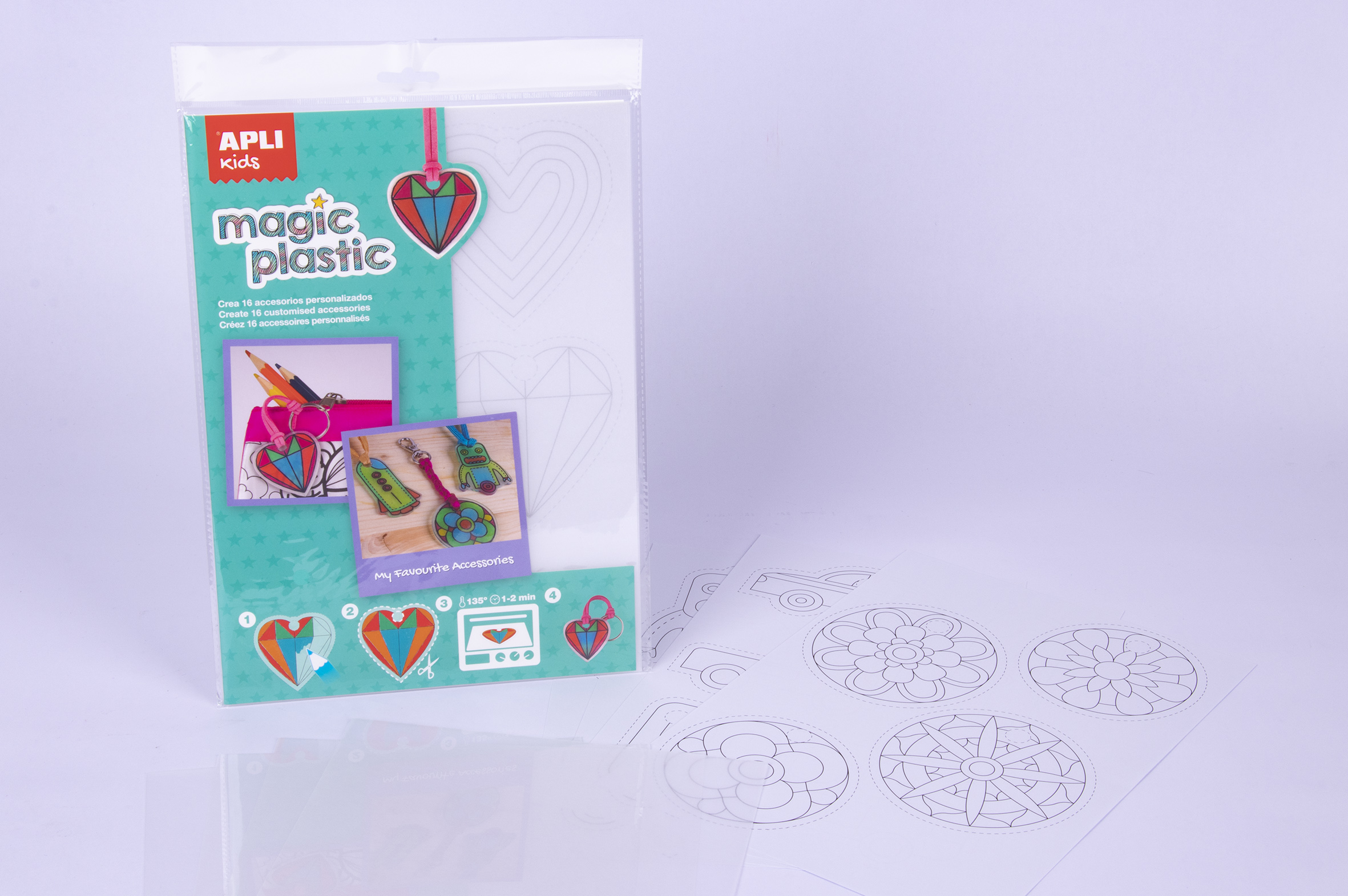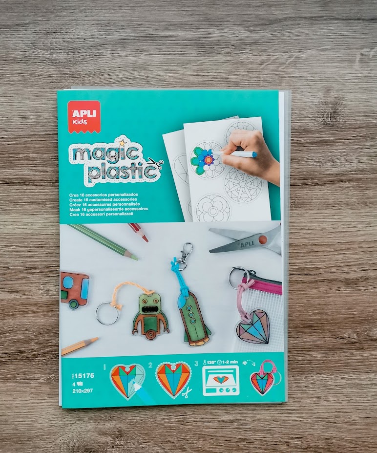 Zestaw Magiczny Plastik to 4 arkusze w formacie A4 oraz zestaw przykładowych szablonów, z pomocą których można wykonać niezwykłe ozdoby. Wystarczą 4 proste kroki: narysuj, wytnij, włóż na 1-2 minuty do piekarnika nagrzanego do 135ºC i użyj do wykonania swoich dekoracji. Magiczny plastik polecany jest do kolorowania kredkami i markerami (dla lepszego efektu zaleca się stosowanie markerów permanentnych). Podczas pieczenia przygotowana ozdoba zmniejszy swój rozmiar 4-krotnie i zmieni w solidny plastik.
