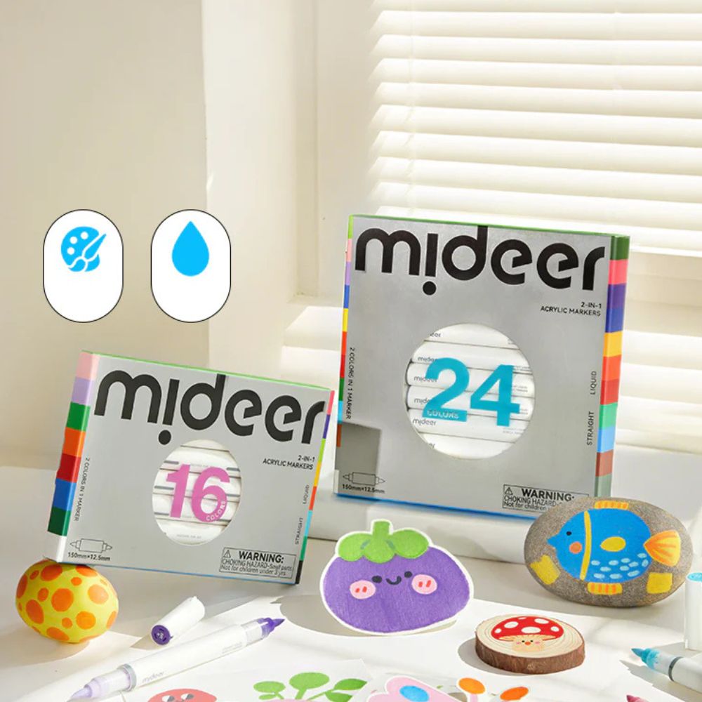 Dwustronne markery akrylowe Mideer 2w1 to praktyczne narzędzie do rysowania, kolorowania i dekorowania, które realnie ułatwia twórczą zabawę. Czasami trudno zdecydować, który kolor najlepiej pasuje do kolejnego fragmentu rysunku, dlatego dwustronne markery Mideer, łączące dwa odcienie w jednym narzędziu, pozwalają jednym ruchem zmienić barwę i porównać efekty bez przerywania pracy