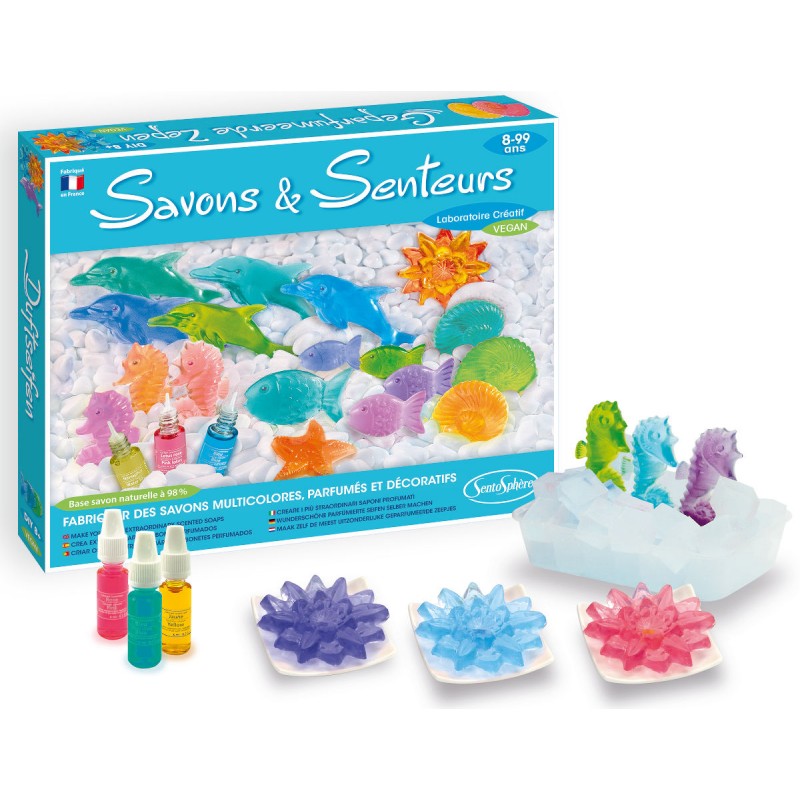 Zestaw do stworzenia mydełek zapachowych Sentophere to wyjątkowy zestaw kreatywny, który pozwala na zabawę z dzieckiem. Dzięki aromatom i barwnikom, a także pomysłowym foremkom, można samodzielnie stworzyć pełną gamę różnokolorowych mydełek o przyjemnym zapachu. Zawartość opakowania: baza glicerynowa do mydeł (450g), 10 foremek do mydełek, 2 aromaty kosmetyczne, 3 barwniki kosmetyczne, 5 pipetek do dozowania, instrukcja.