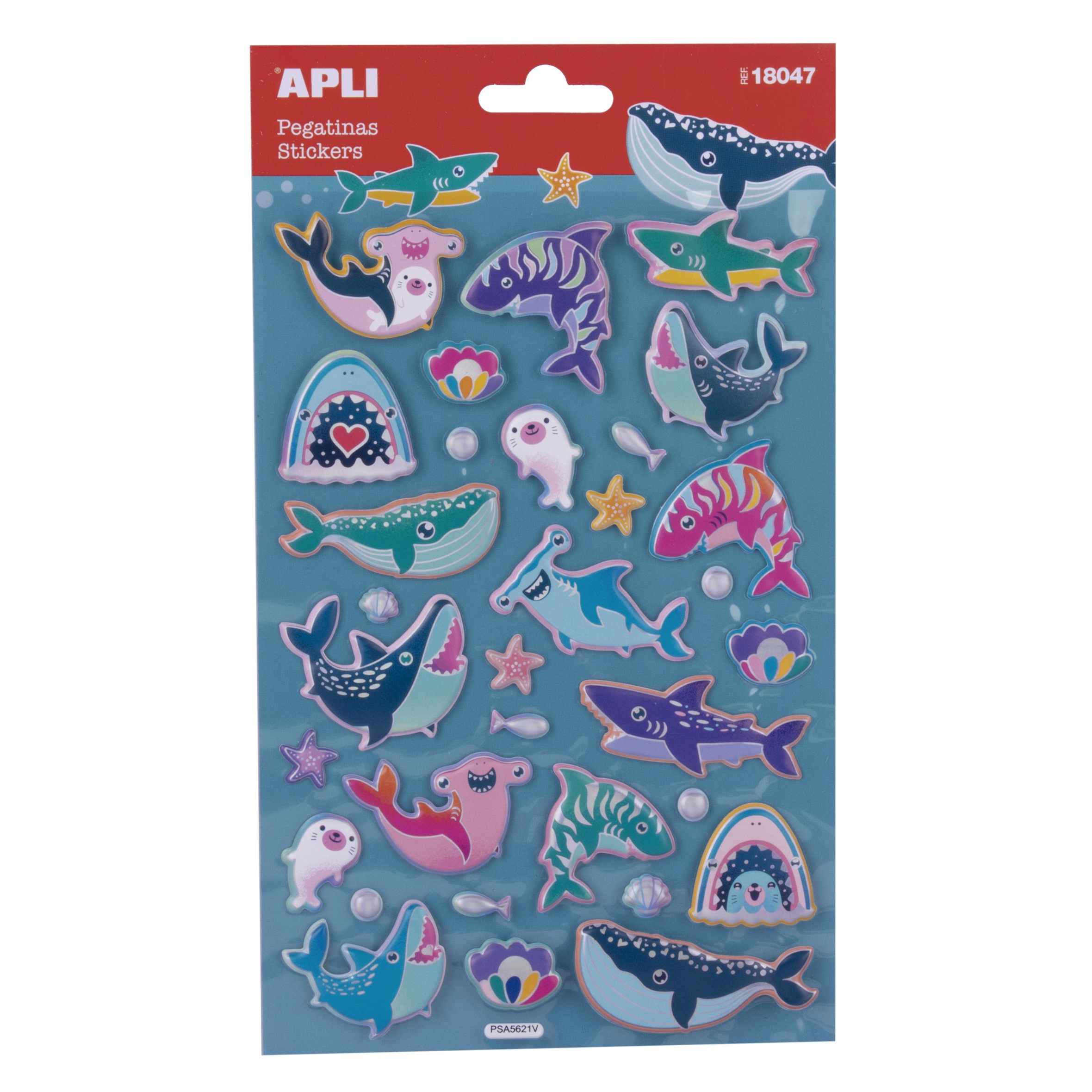 Arkusz metalicznych naklejek marki Apli Kids ucieszy każdego maluszka. Dzieci wprost uwielbiają naklejać! Zestaw składa się z 32 wypukłych oraz permanentnych naklejek z motywem morskim i metalicznym wykończeniem. Można nimi ozdobić szkolny zeszyt, prace plastyczną, album ze zdjęciami, laurkę, zaproszenie na urodziny, itp. Podczas zabawy dziecko rozwinie kreatywność, wyobraźnię, koordynację ręka-oko, zdolności narracyjne.