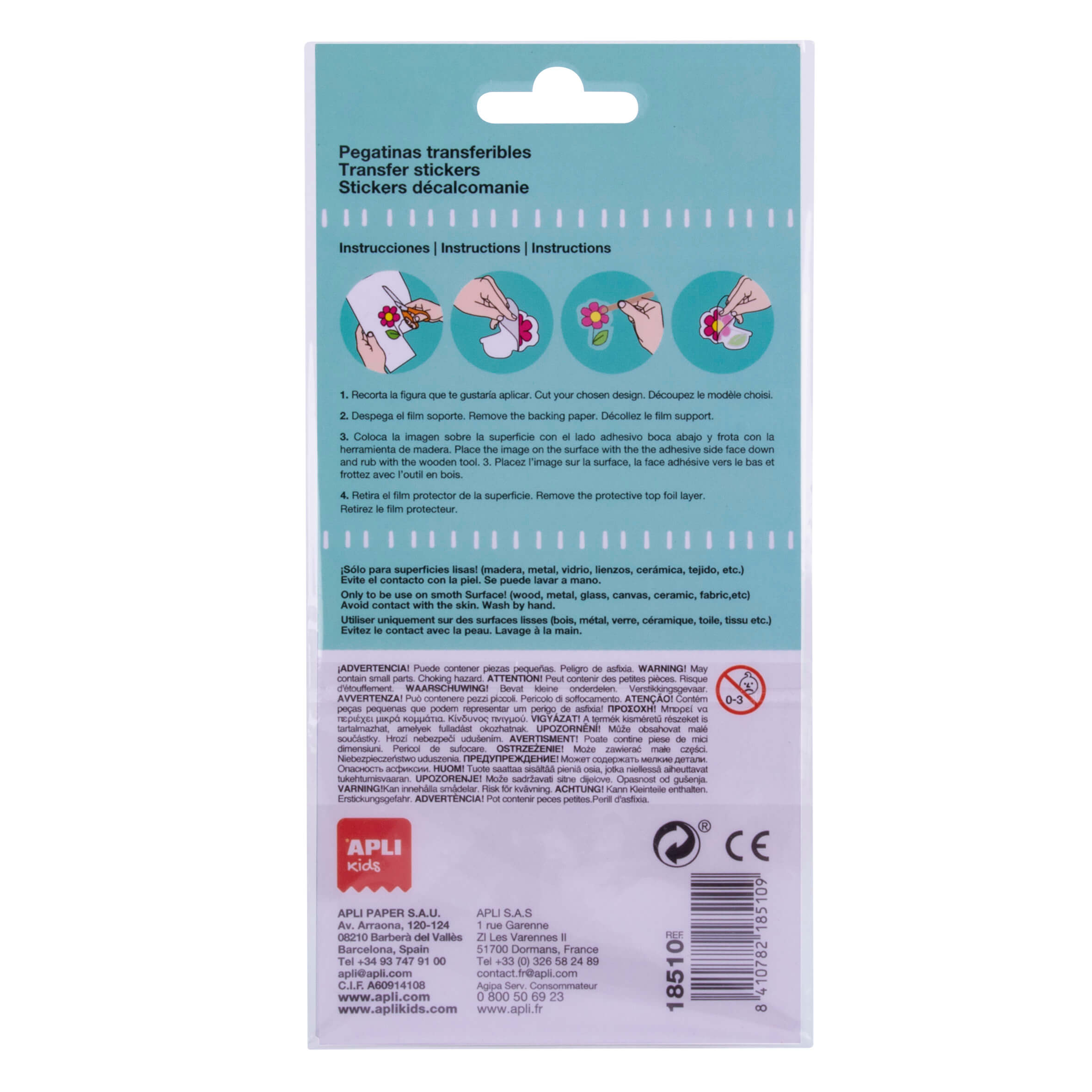 Arkusz transferowych naklejek marki Apli Kids ucieszy każdego maluszka. Dzieci wprost uwielbiają naklejać! Zestaw składa się z 10 naklejek, umieszczonych na transferowej folii oraz drewnianego patyczka. Podczas zabawy dziecko rozwinie kreatywność, wyobraźnię, koordynację ręka-oko, zdolności narracyjne. Naklejki przyozdobią dowolny przedmiot jak np. kubek, ramka czy szafka. Możesz je umieścić na płaskich i gładkich powierzchniach (drewno, metal, płótno, szkło, ceramika, tkanina). Aby je nakleić wykonaj proste 4 czynności: