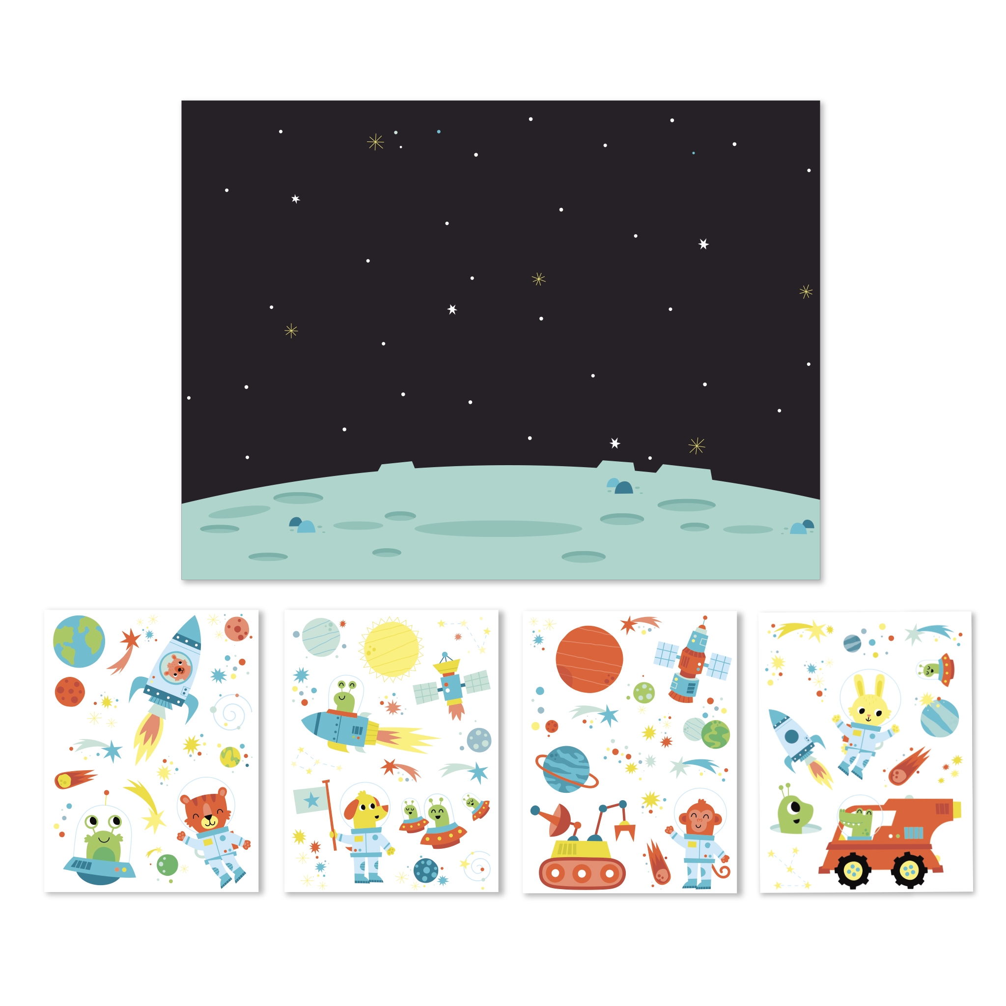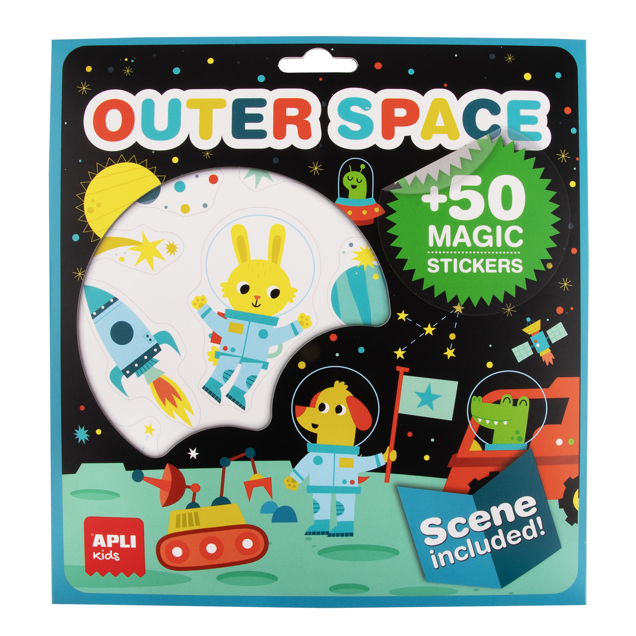 Zestaw naklejek wielokrotnego użytku z planszą to idealna rozrywka dla maluchów. W skład zestawu wchodzą cztery arkusze pełne barwnych naklejek oraz plansza, na której można je dowolnie umieszczać. Dzięki prostemu systemowi przyklejania i odklejania, dzieci mogą dowolnie zmieniać układ naklejek. Naklejki przedstawiają m.in. statki kosmiczne, różnorodne postacie, planety, gwiazdy i satelity.
