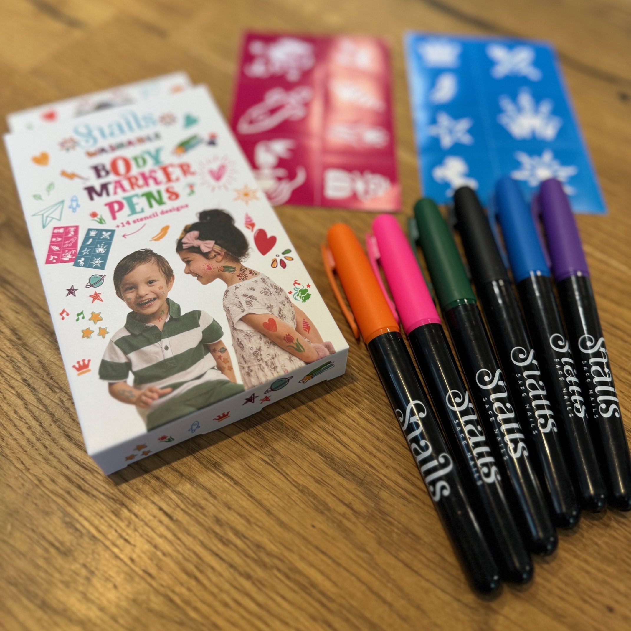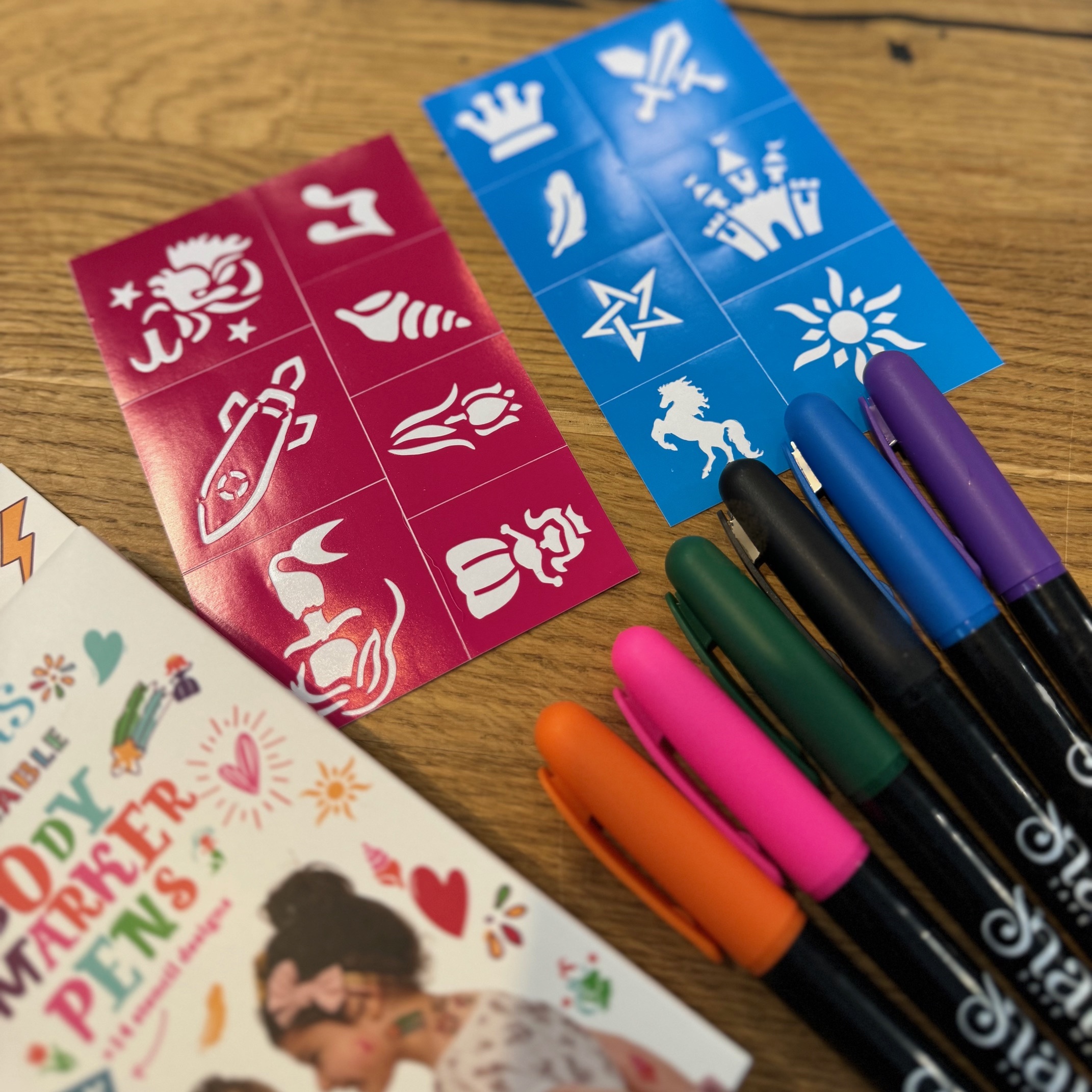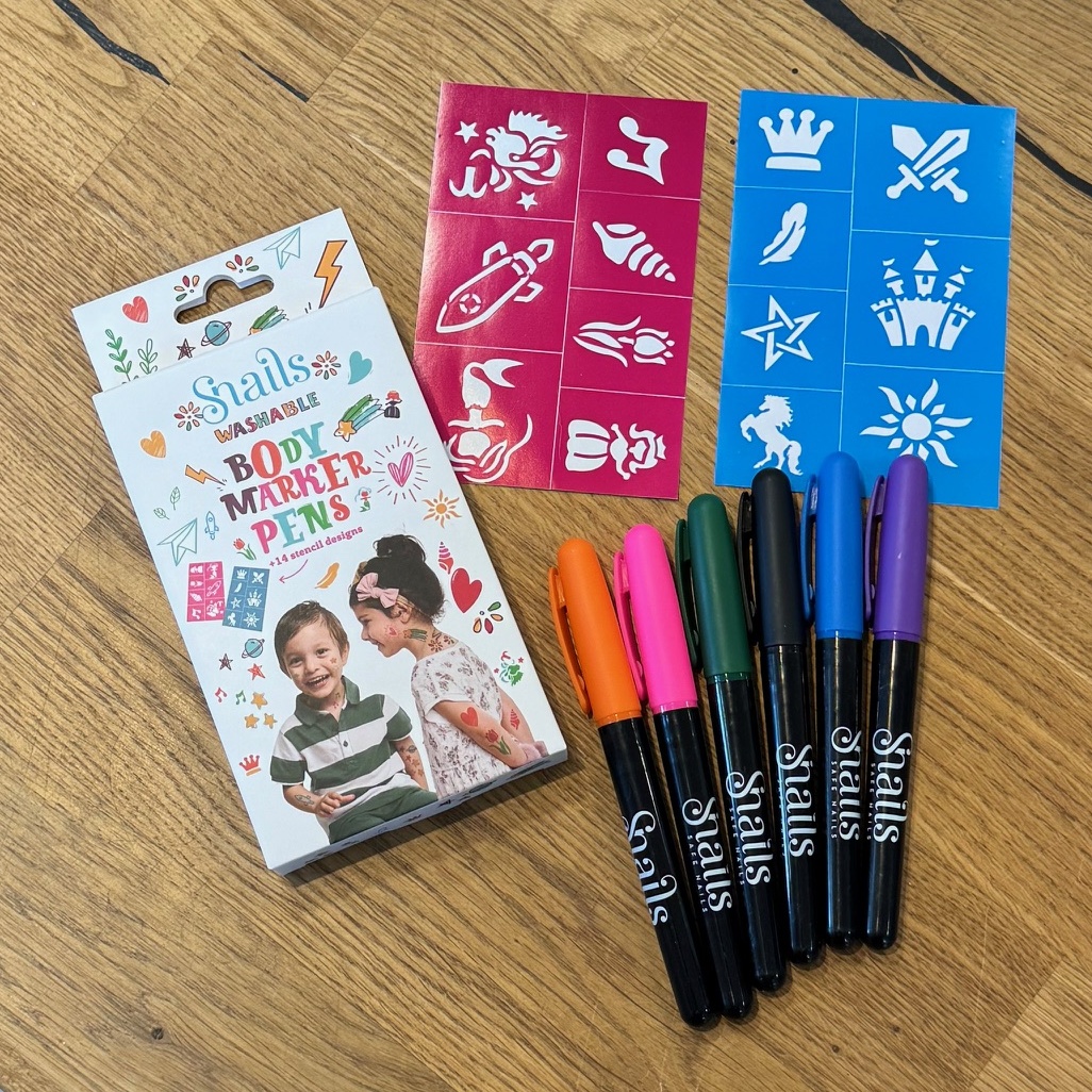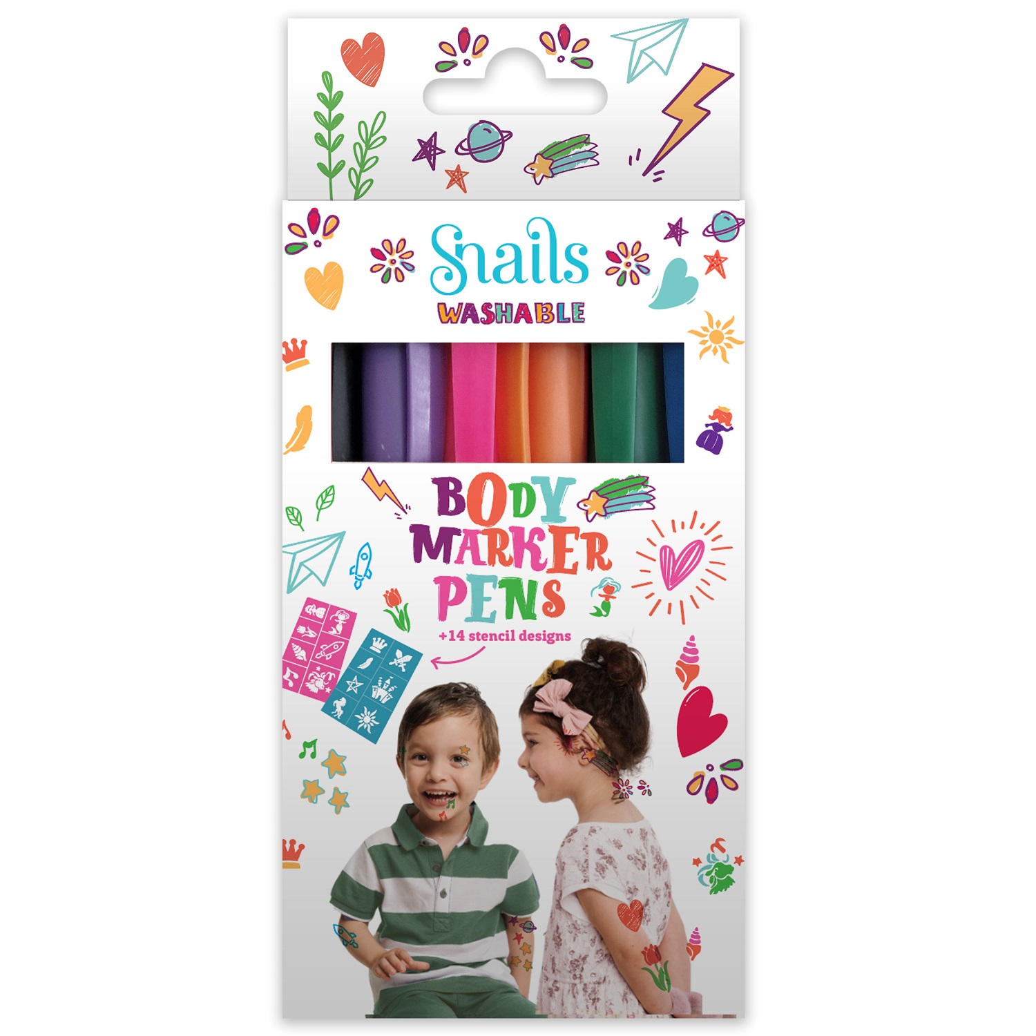 Kolorowe pisaki do malowania ciała dla dzieci marki Snails zapewniają niezapomnianą i kreatywną zabawę. Zestaw zawiera: 6 barwnych pisaków i dwa szablony (14 wzorów), umożliwiając dzieciom tworzenie wyjątkowych wzorów. Flamastry są bezpieczne dla delikatnej skóry i łatwo zmywają się wodą z mydłem. Doskonale sprawdzą się zarówno podczas domowej zabawy, jak i na dziecięcych imprezach, takich jak urodziny czy bale przebierańców.