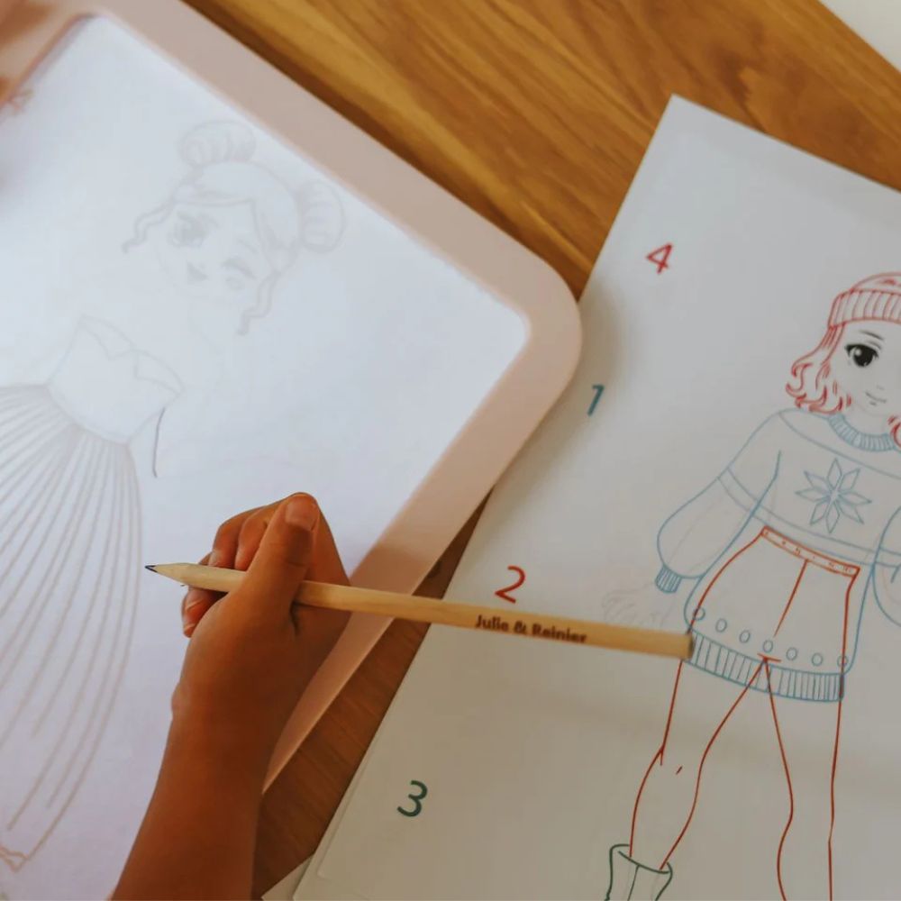 Jedna strona tabletu pozwala na rysowanie i pisanie z podświetleniem, a druga strona pełni funkcję tablicy z efektem neonu. Dzieci mogą tworzyć nieskończoną liczbę kombinacji – odwzorowywać sylwetki, stroje, dodatki i wzory - ponad 1000 różnych możliwości, jak w prawdziwym studiu mody.