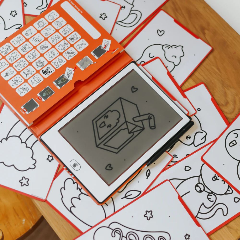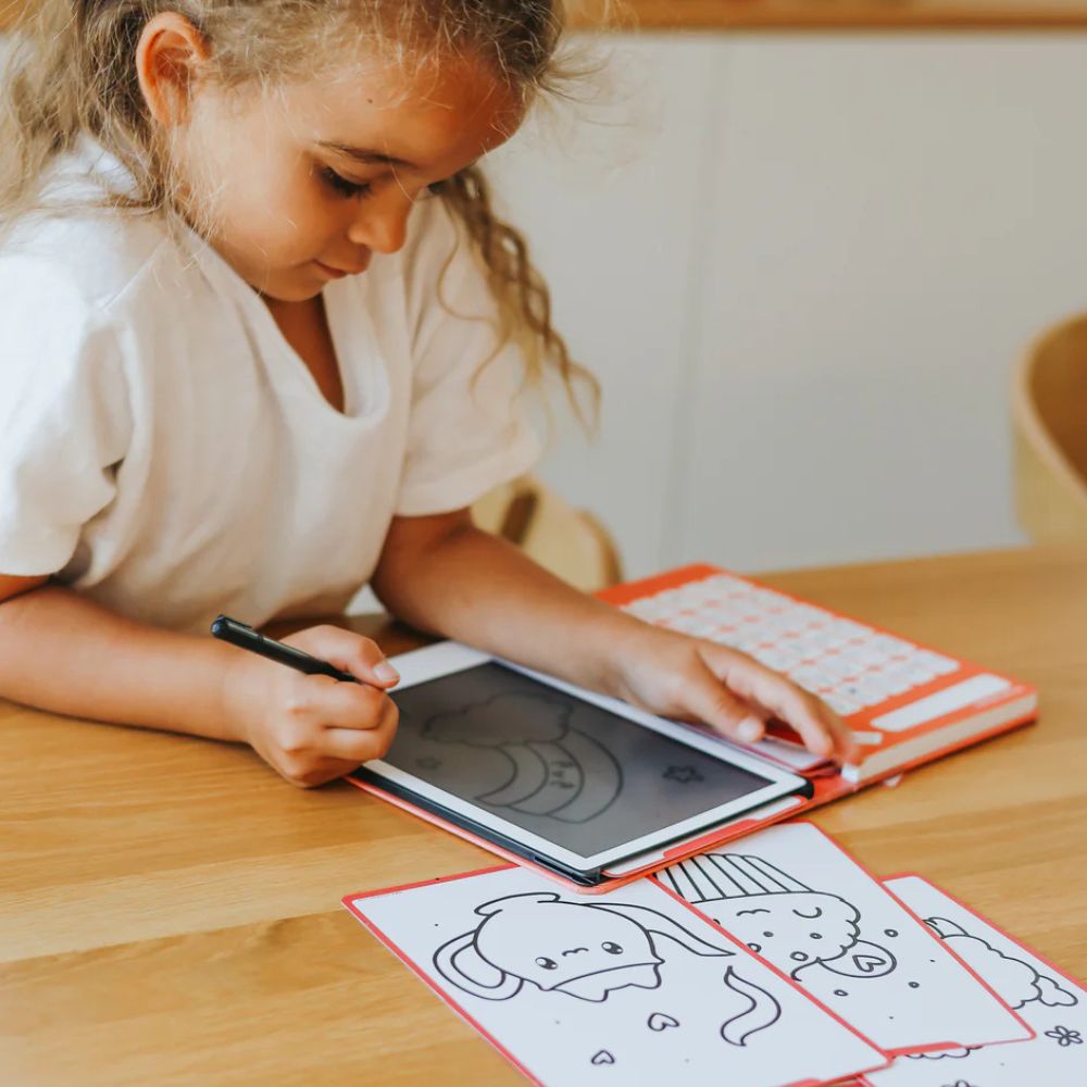 KIDYDRAW-MINI łączy w sobie tradycyjną formę książki z nowoczesną technologią ekranu LCD. Wewnątrz znajdziesz 30 inspirujących ilustracji, dzięki którym rysowanie staje się dziecinnie proste! Wystarczy włożyć obrazek do tabletu i śledzić linie, tworząc własne wersje ulubionych przedmiotów, zwierzątek itp.
