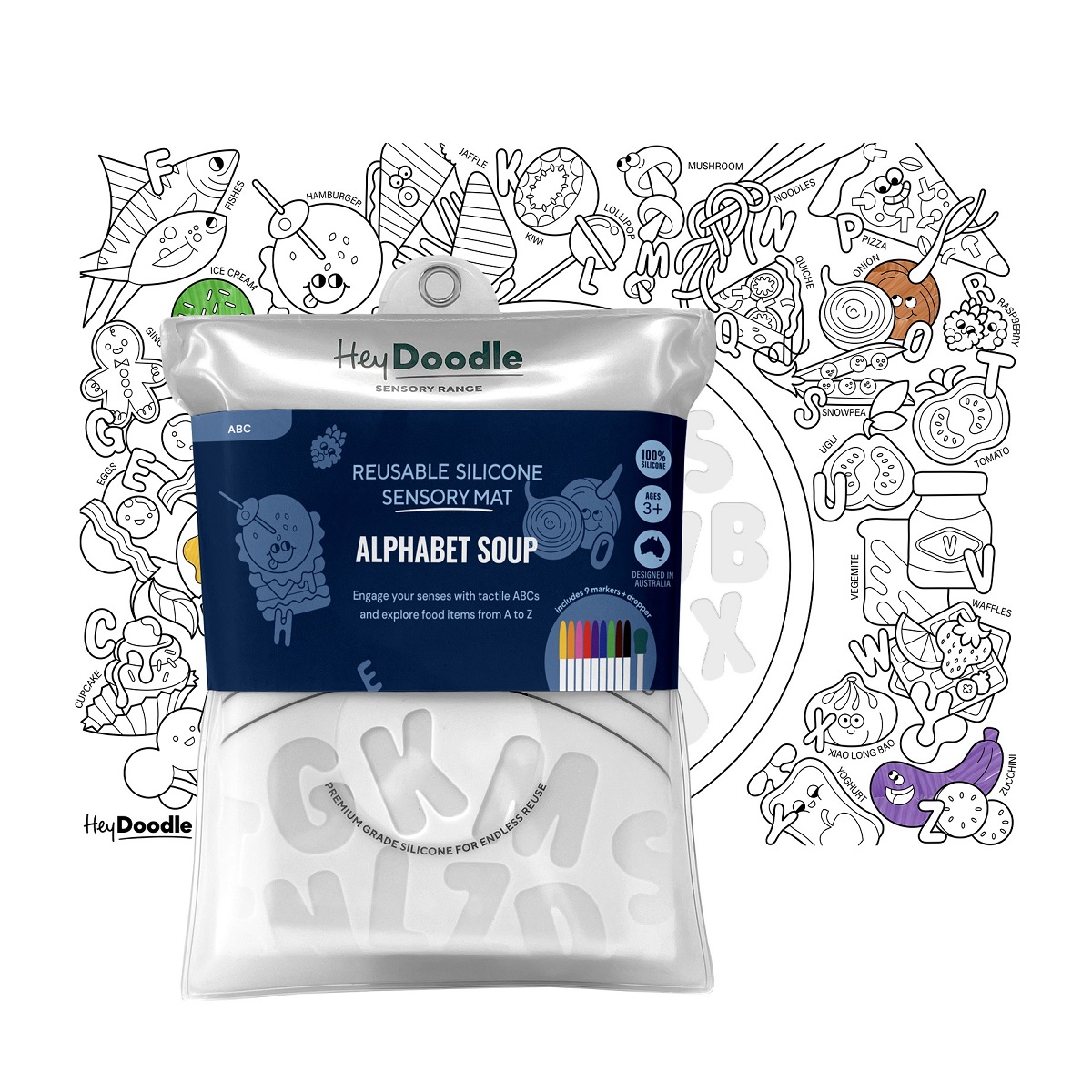 Sensoryczna mata silikonowa do wielokrotnego kolorowania HeyDoodle w wersji: Alfabetyczna zupa