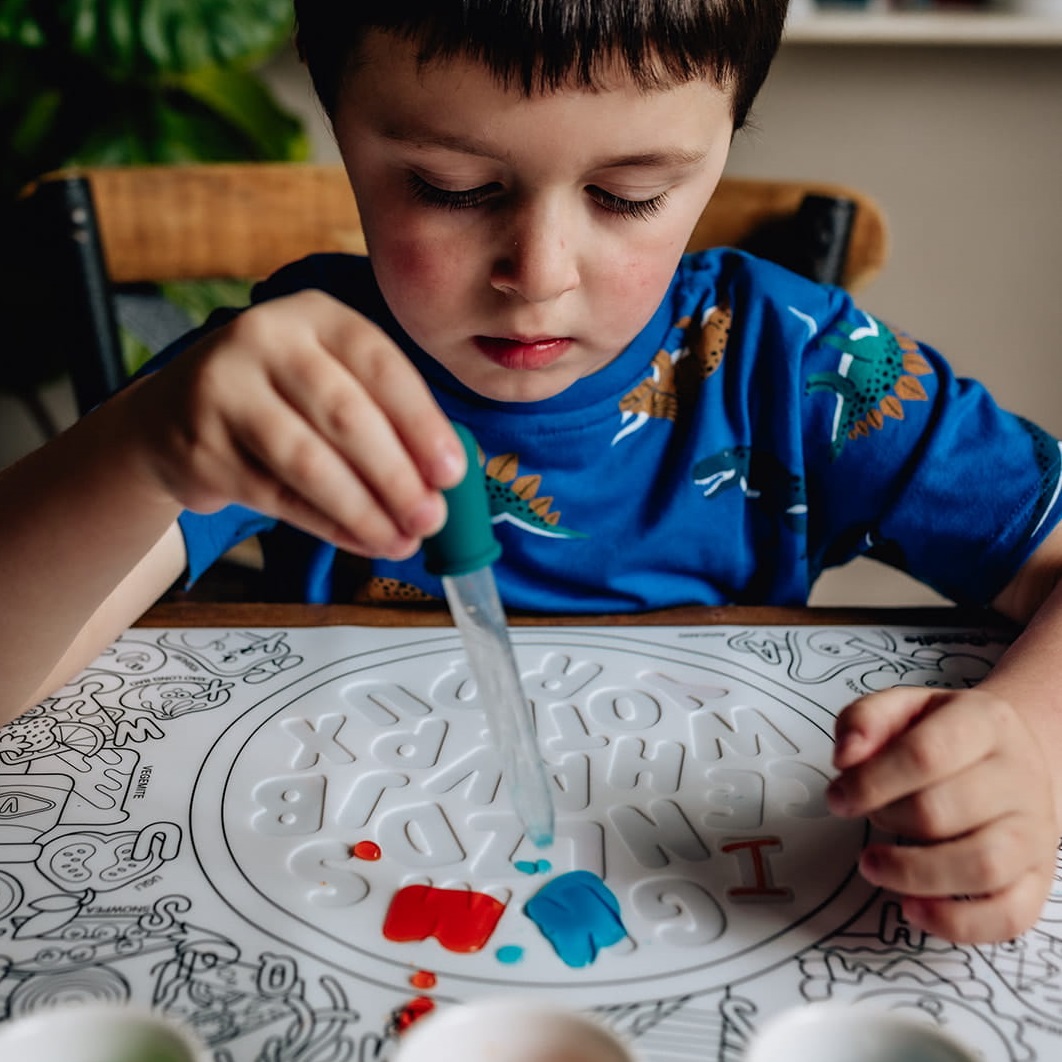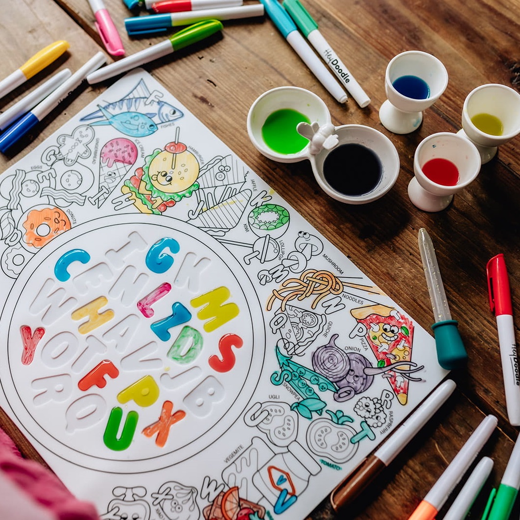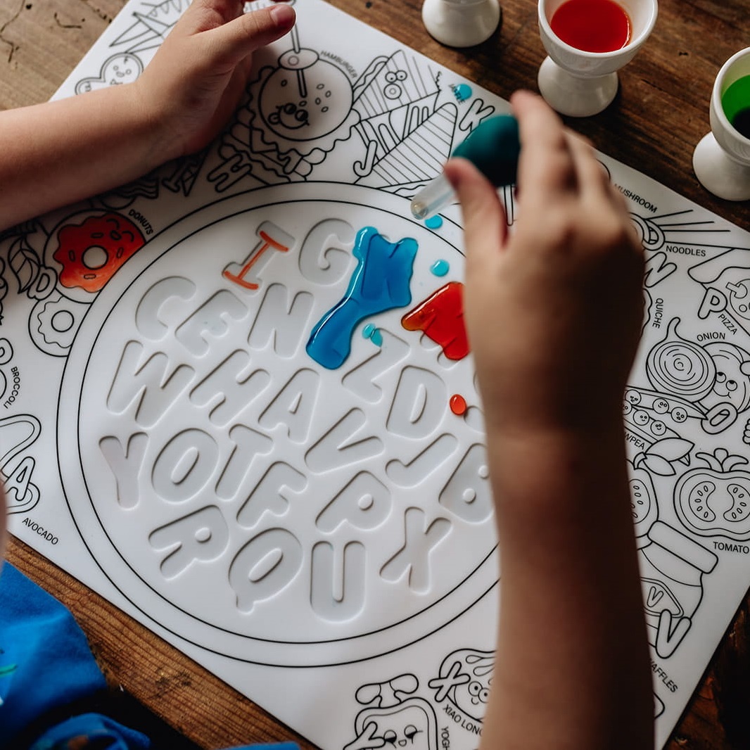 Silikonowa mata w rozmiarze A3 przedstawia pyszne jedzenie do kolorowania (warzywa, owoce, lody itd.) oraz zupę z literek, które są wydrążone na macie. Po zabawie matę można wyczyścić i użyć ponownie, ponownie i ponownie kolorując, pisząc i ucząc się!
