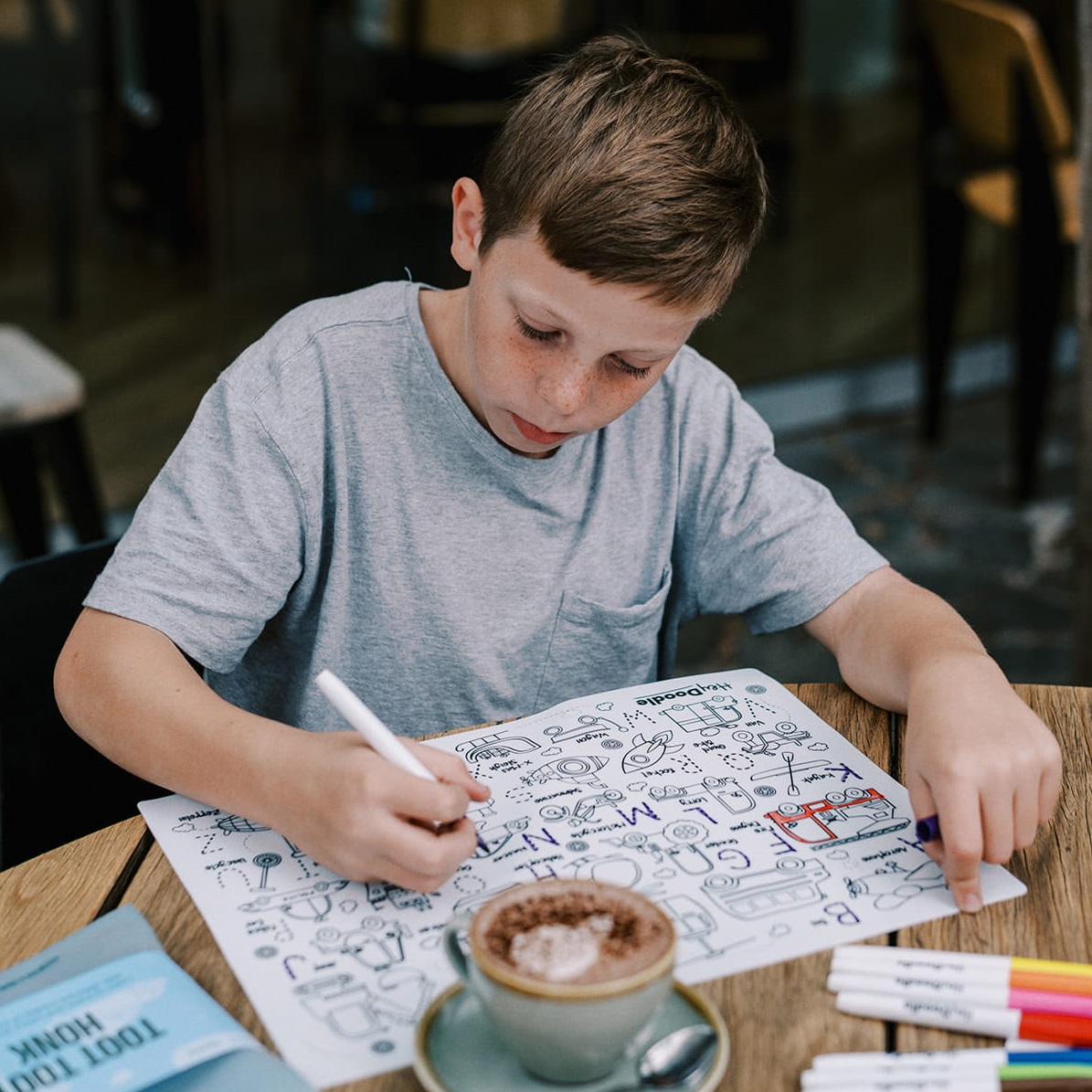 Australijska firma HeyDoodle zaprojektowała opakowania tak, aby było ładne i praktyczne. Maty idealnie sprawdzą się na prezent, a potem w zabawie w domu, w podróży, w samochodzie, u babci i cioci, a po zabawie, można ponownie schować flamastry i matę do estetycznego opakowania.