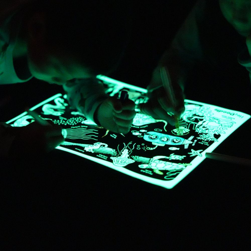 Koloruj i rysuj, daj się ponieść podwodnej przygodzie. Zanurz się w głębiny łodzią podwodną i odkryj świecący podwodny świat - niezwykłe ryby, ośmiornica, meduza, rafa koralowa i wiele innych niezwykłych stworzeń. Silikonowa mata A4 ma do kolorowania bioluminescencyjne stworzenia żyjące w głębinach oceanów. Zgaś światło i zobacz jak świecą w ciemności. Po zabawie matę można wyczyścić i użyć ponownie, ponownie i ponownie kolorując i ucząc się!