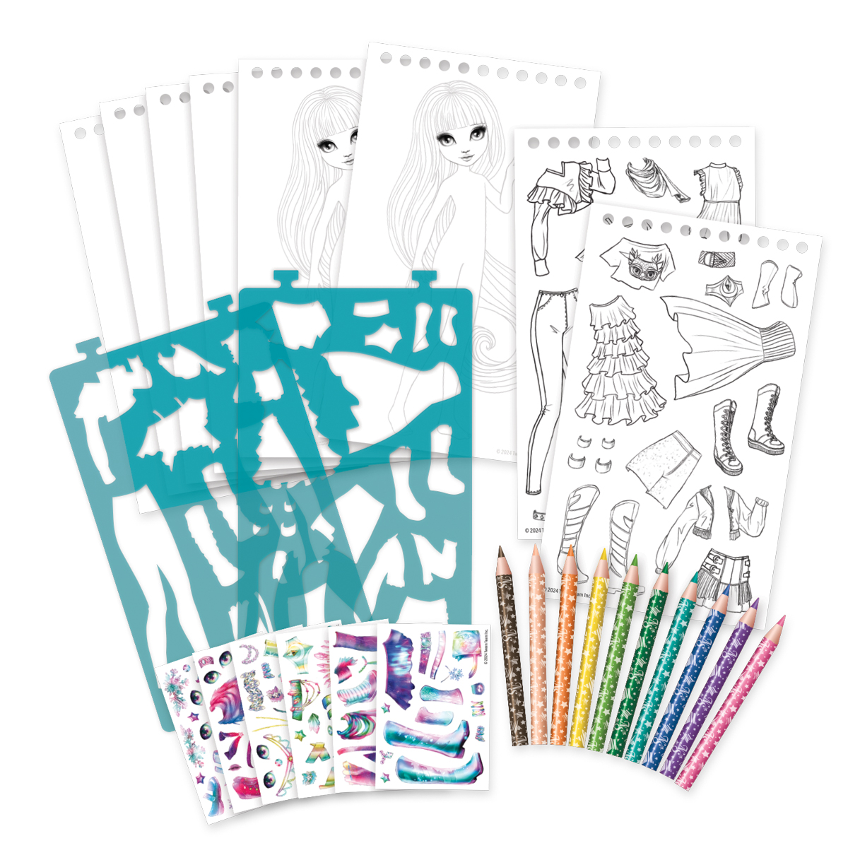 Zawartość zestawu: 20 stron do szkicowania, 2 strony szablonów (28 elementów), 6 mini arkuszy z naklejkami (100 naklejek), 10 kolorowych kredek, instrukcja z teorią kolorów i wskazówkami, poręczne opakowanie z magnetycznym zamknięciem