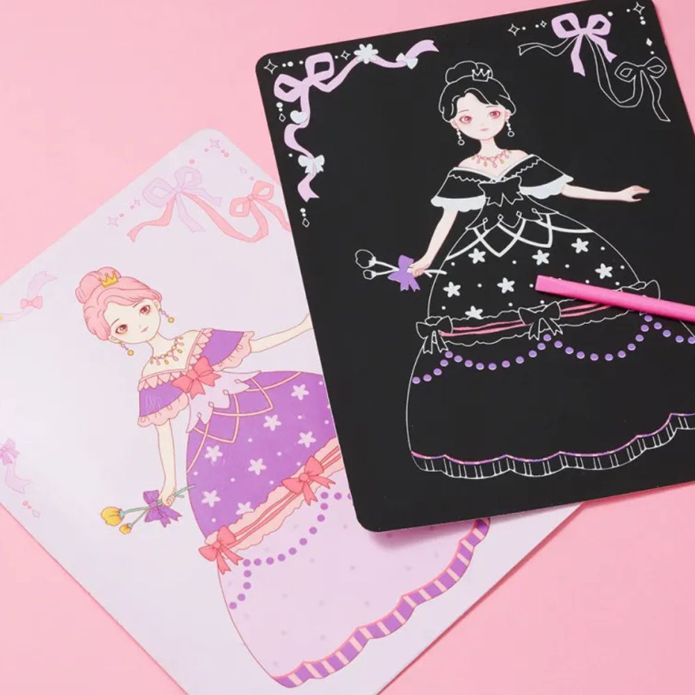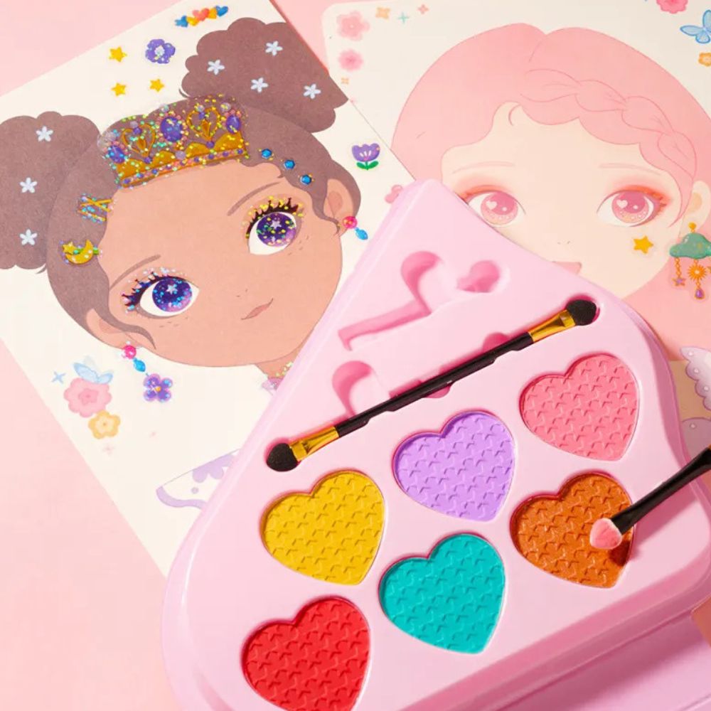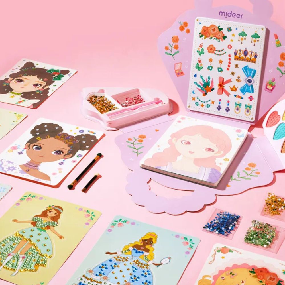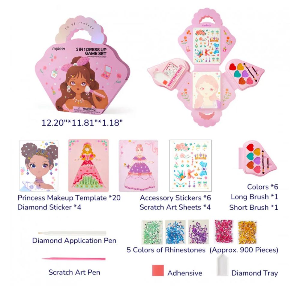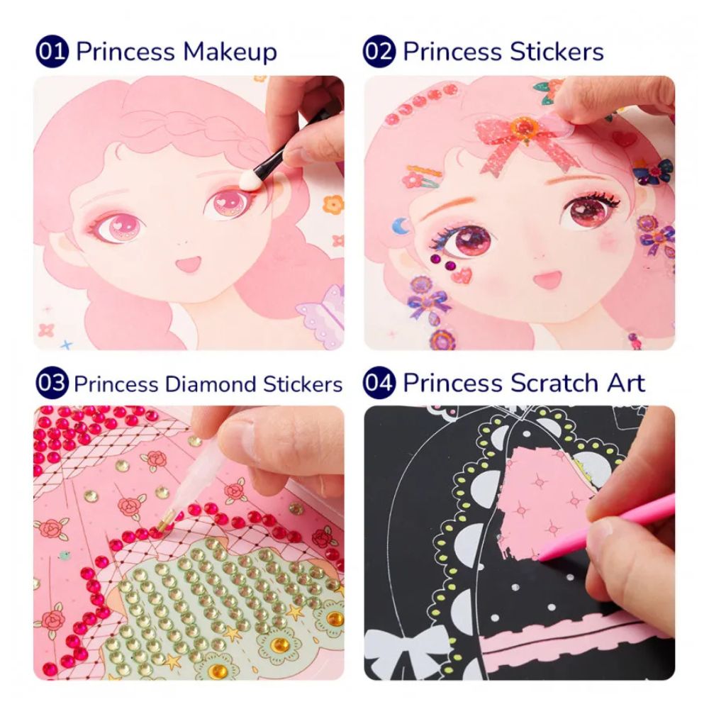 Zestaw oferuje różne możliwości zabawy: wyklejanie naklejkami i diamencikami, wydrapywanie oraz tworzenie makijażu.