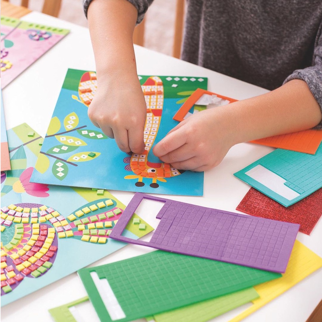 Zestaw artystyczny Apli Kids Mozaika idealnie rozwija małą motorykę u dzieci. Przy okazji świetnej zabawy, maluchy ćwiczą precyzję i cierpliwość. Zabawa polega na uzupełnieniu rysunków kolorowymi elementami z pianki EVA. W zestawie znajdziecie 4 arkusze do wyklejenia oraz 1210 naklejek.