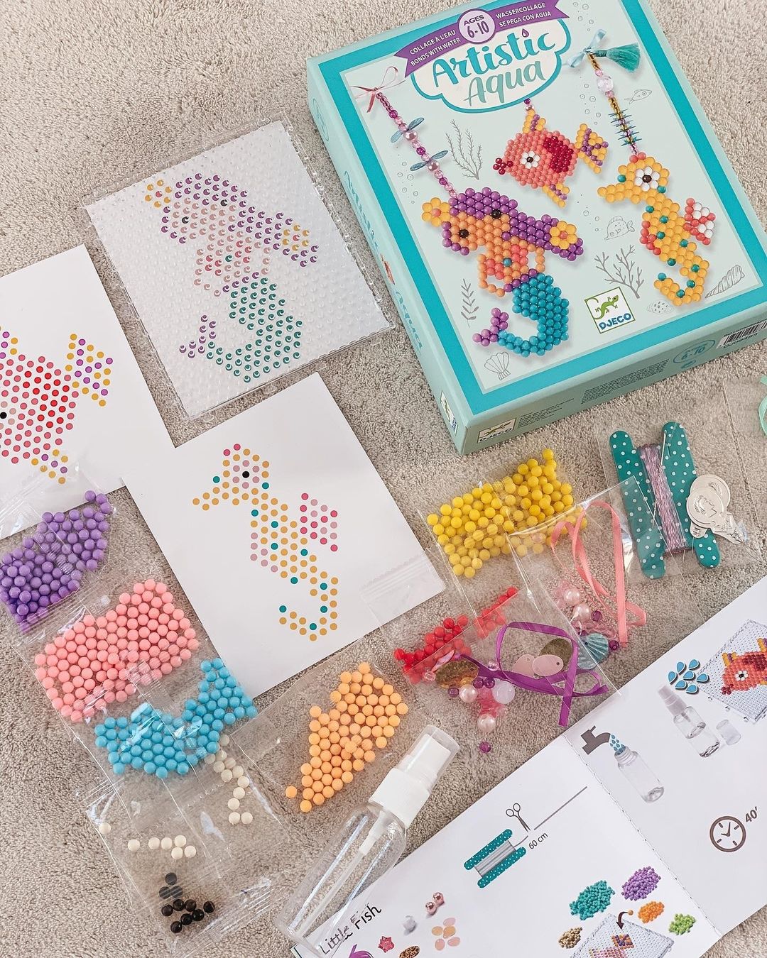 Zestaw kolaży wodnych „UROKI MORZA” to kreatywny zestaw dla dzieci, które za pomocą perełek i wody wykonają zawieszki, które przylegają do siebie pod wpływem wody. Z zestawu można stworzyć syrenkę, rybkę i konika morskiego.