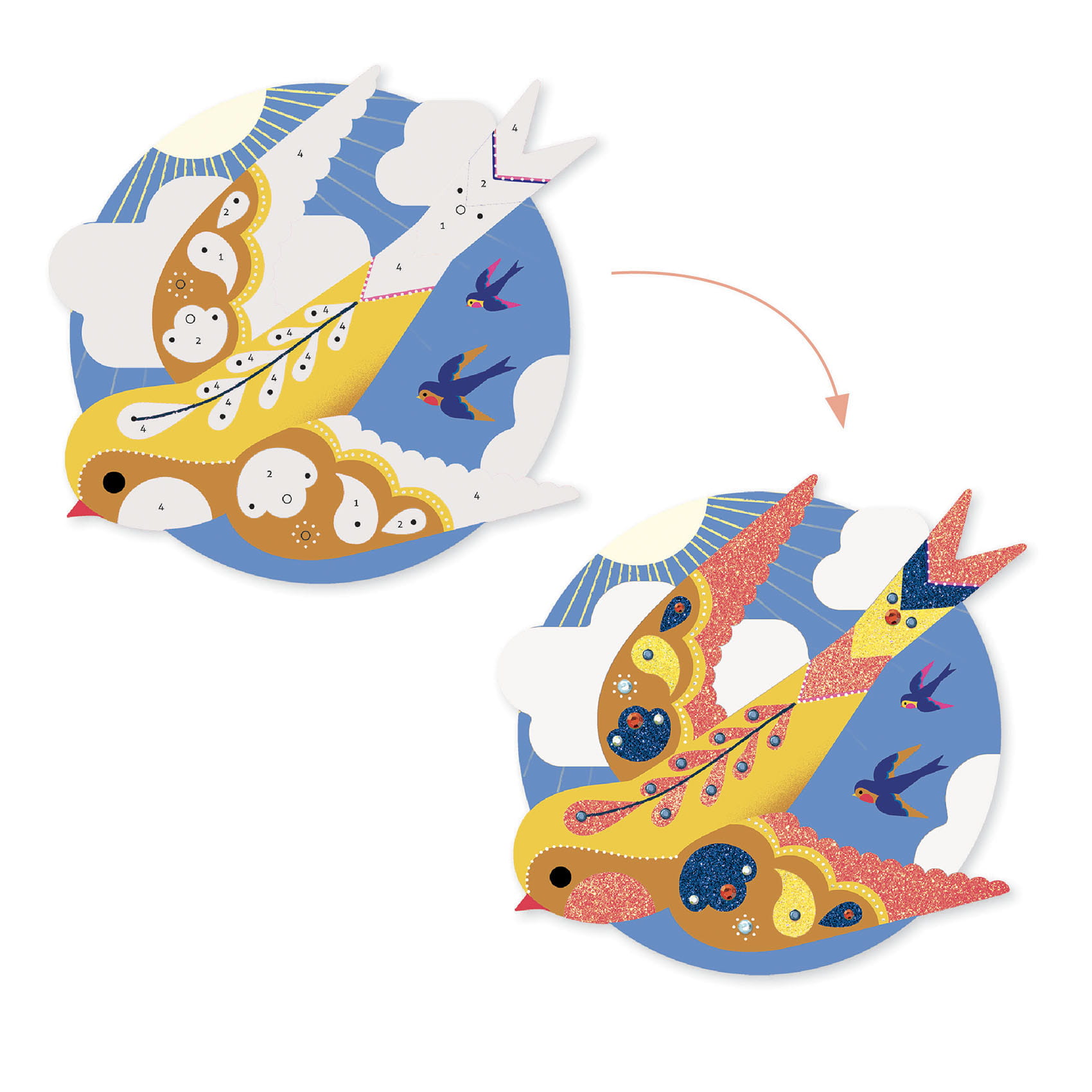 Kreatywny zestaw do stworzenia pięknych obrazów z rajskimi ptakami, z kolorowych błyszczących cekinów i brokatu.