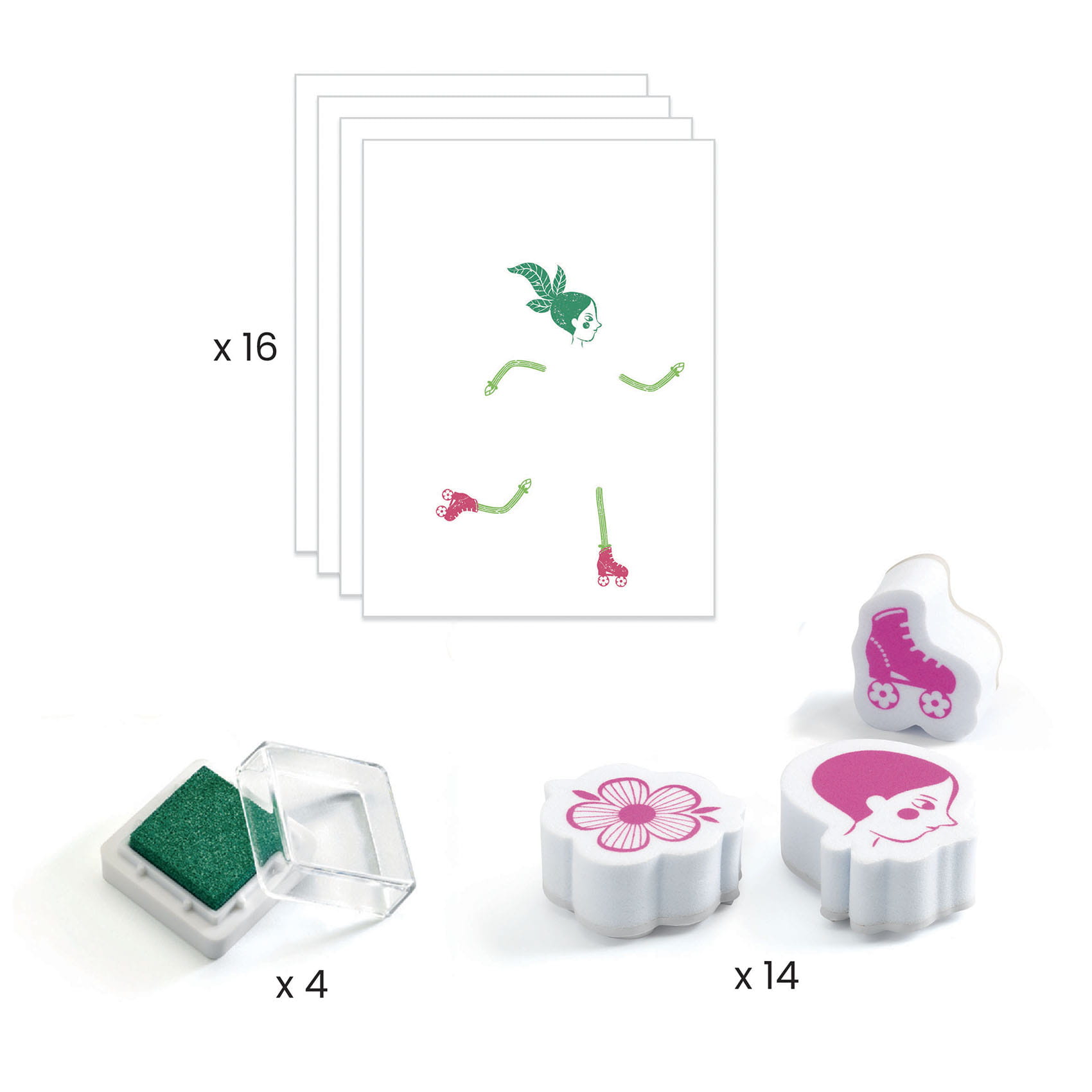 Z zestawem pieczątek i 4 kolorowych tuszy z łatwością skomponujesz własne postacie, łącząc kształty i różne kolory. W wykonaniu zadania pomogą ilustrowane arkusze, które należy wypełnić pieczęciami. Do zestawu dodano także instrukcję "krok po kroku". Zabawka sprawdzi się jako prezent dla fanów aktywności plastycznych.
